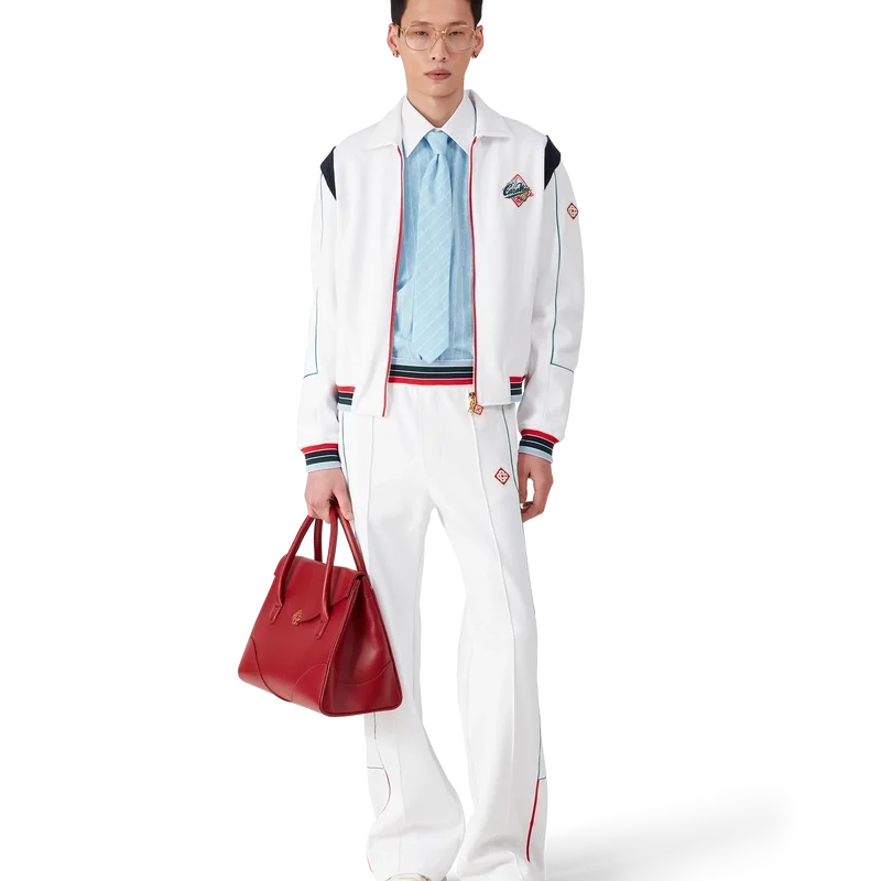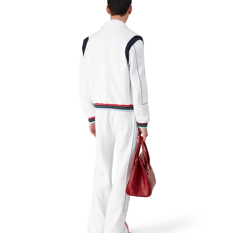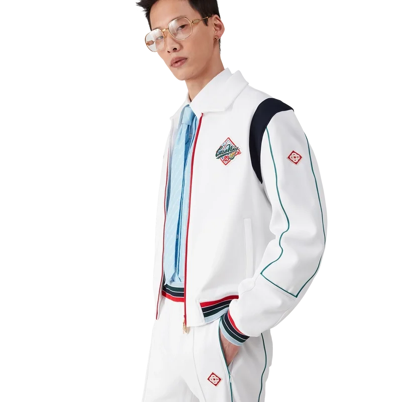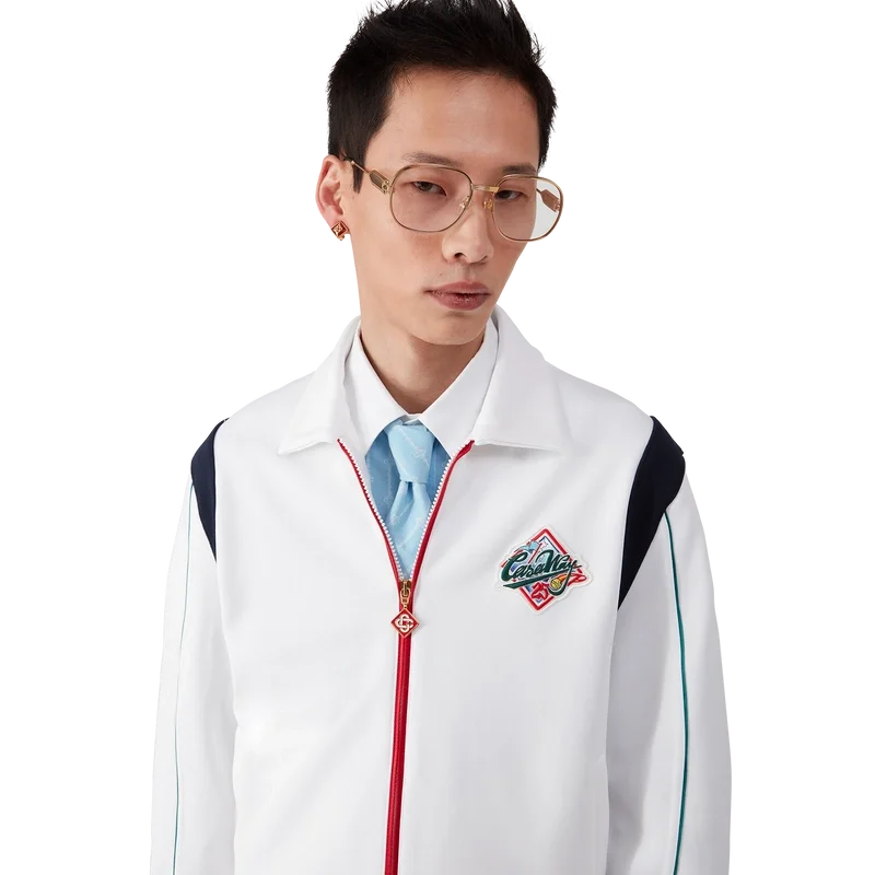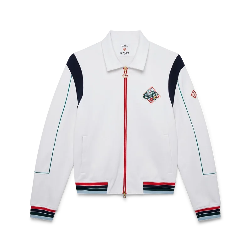 Die Casa Way Sportjacke ist ein langärmeliges Sportbekleidungsmodell aus Trikotstoff. Mit geripptem Kragen, Reißverschluss, gestreiften gerippten Bündchen und Saum, kontrastierendem Schulterpanel, Casa Way World Series-Motiv, das klassische amerikanische Baseball-Embleme für Casa Way Tennis neu interpretiert, Paspeldetails, charakteristischem Diamant-Logo, Futter und Leistentaschen.