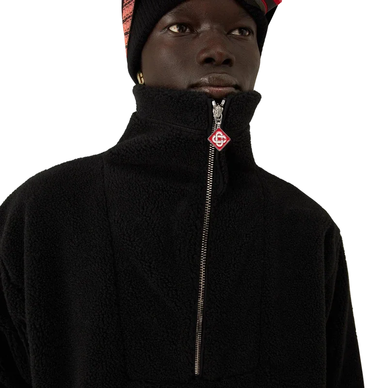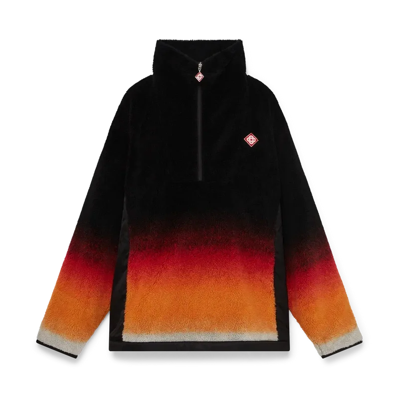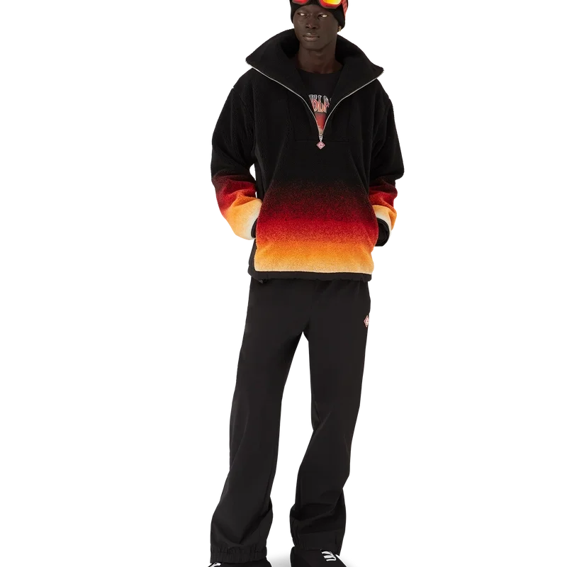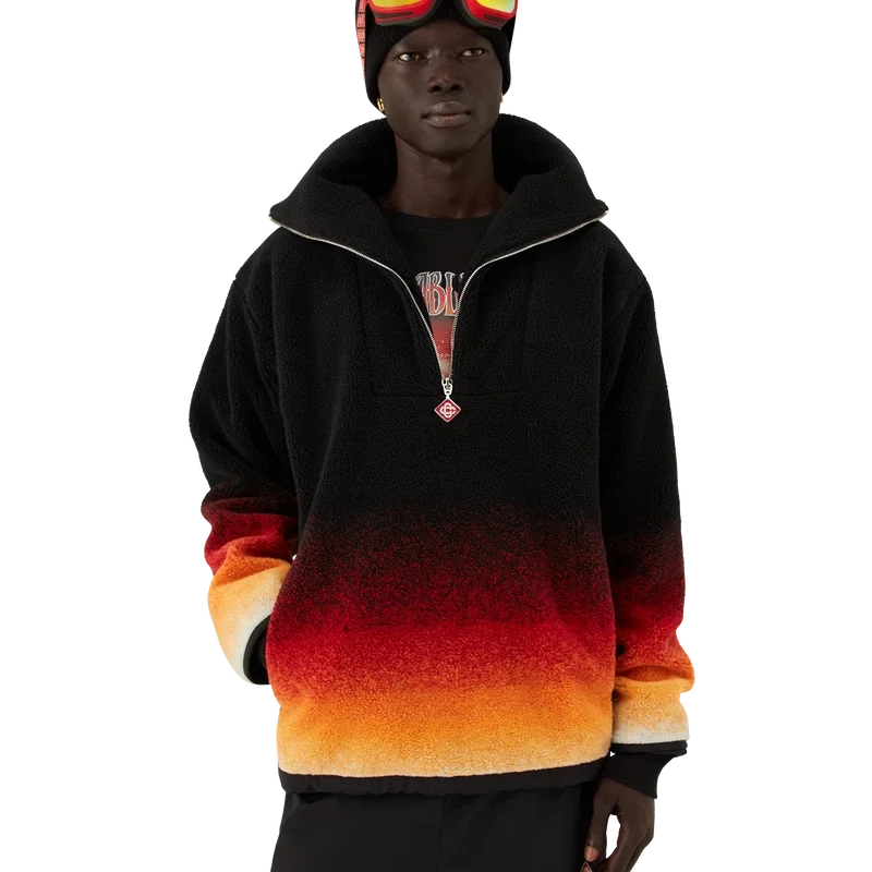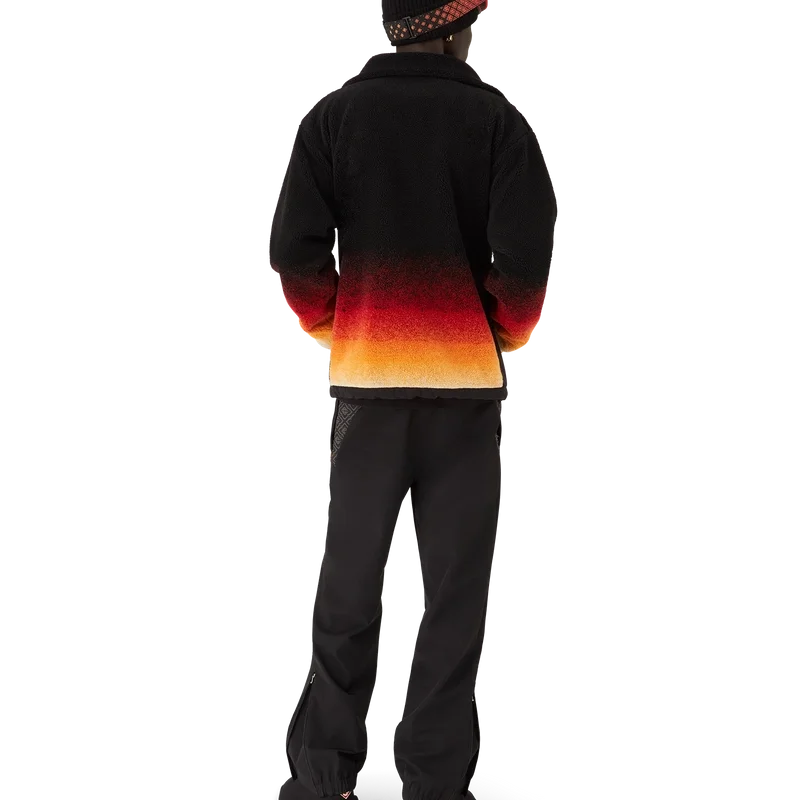 Das Gradient Fleece besticht durch eine raffinierte Silhouette aus einem schwarzen Mohair-Mischgewebe mit einem leuchtend orangefarbenen Farbverlauf, inspiriert vom legendären Pulverschnee, der Japans ländliche Bergregionen bedeckt. Angelehnt an die winterliche Landschaft Hokkaidos, wo sich Dörfer unter hoch aufragenden Gipfeln schmiegen, verbindet das Design sportlich-elegante Raffinesse mit alpiner Funktionalität.