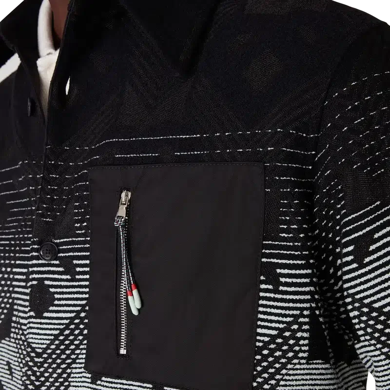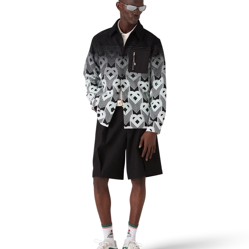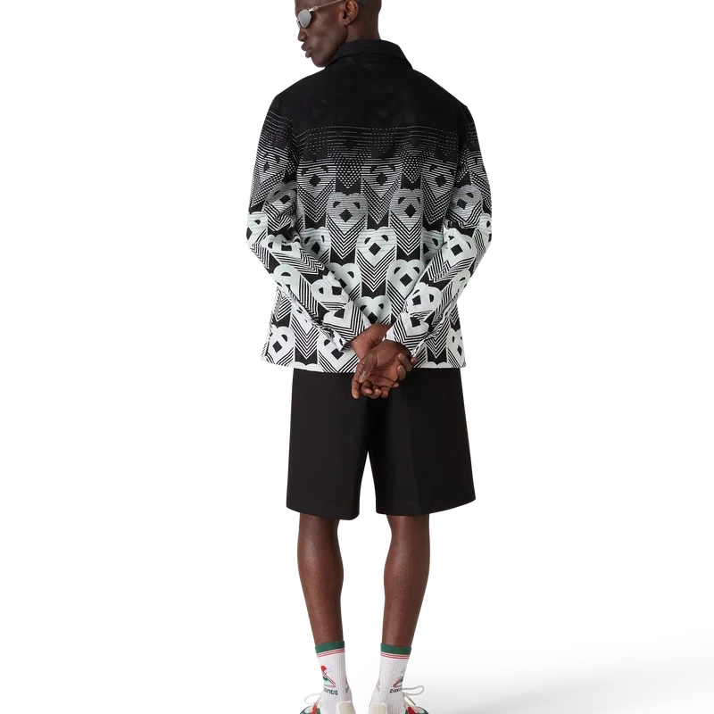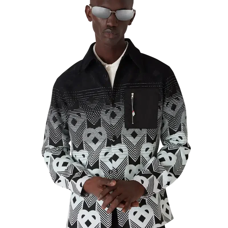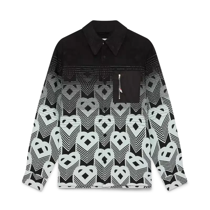 Das Monogram Gradient Shacket ist ein langärmeliges Modell aus Jacquard-Bouclé-Stoff. Mit Kragen, Brusttasche, Knopfverschluss und vergoldeten Markenknöpfen.