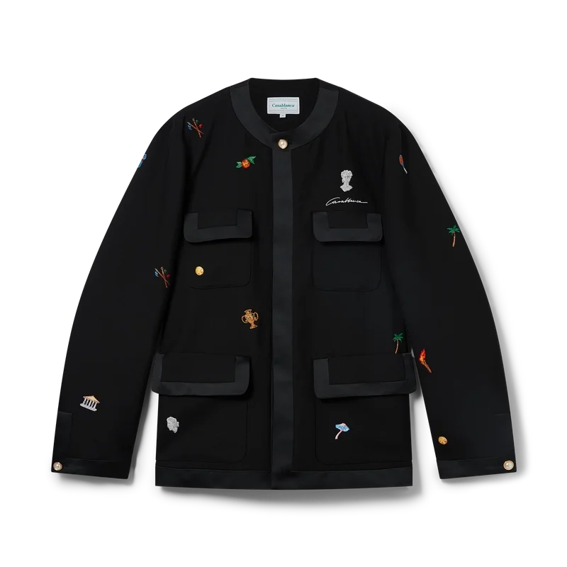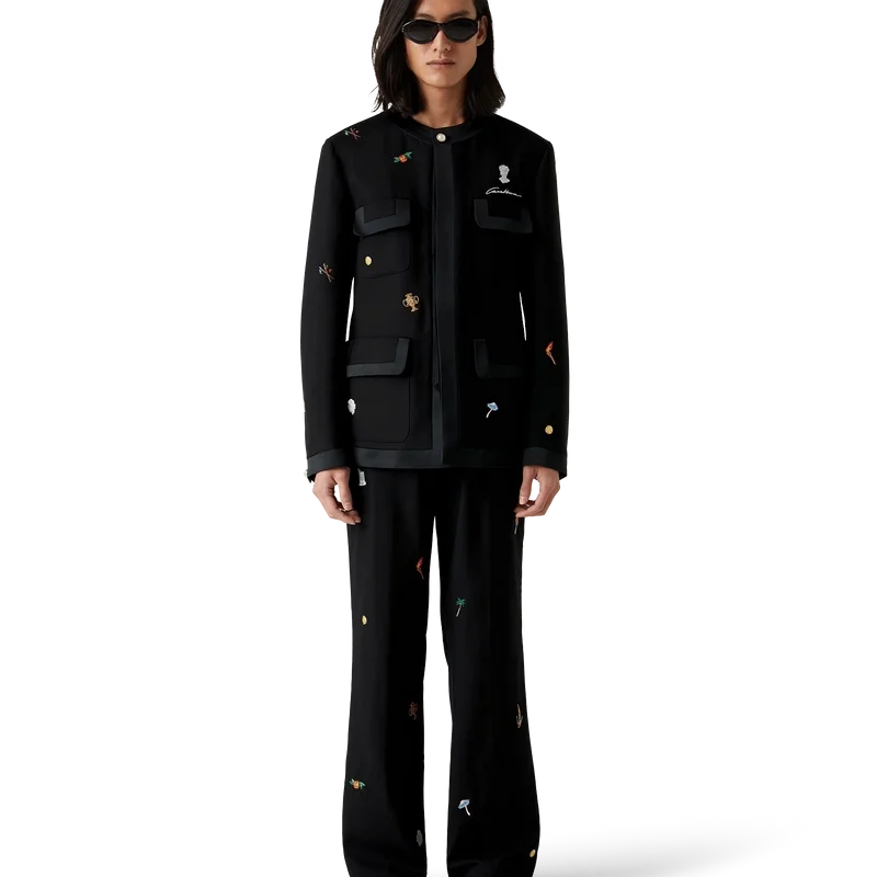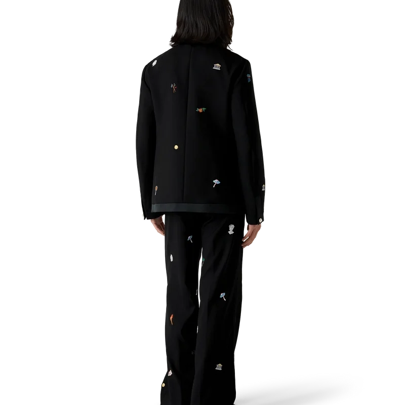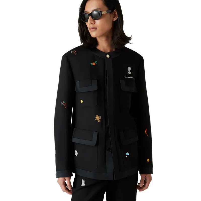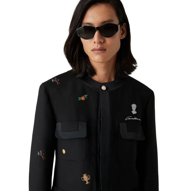 Die bestickte Wolljacke im Tailored-Stil besticht durch eine klassische Silhouette und ist aus besticktem Wollstoff gefertigt. Sie ist mit Stickereien verziert, die die Symbolik des Hauses in Bezug auf Natur und Architektur widerspiegeln, und verfügt über Brusttaschen, ein Futter sowie einen Verschluss mit vergoldeten Druckknöpfen. Sie ist dazu gedacht, mit der dazu passenden Straight-Leg-Jeans getragen zu werden.