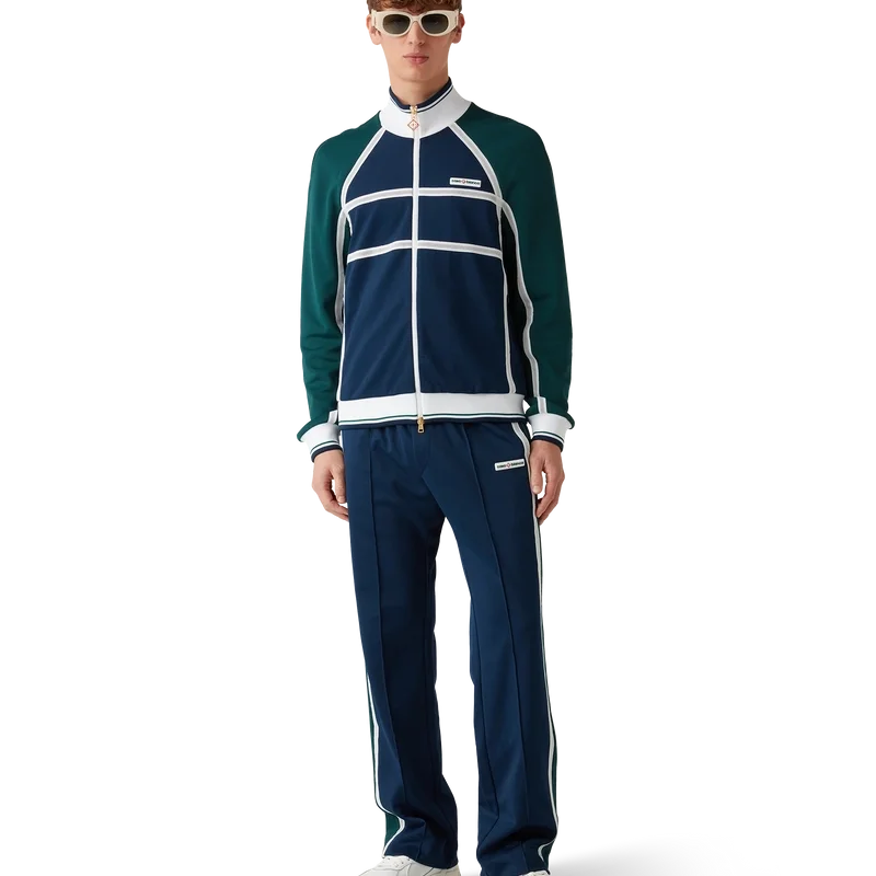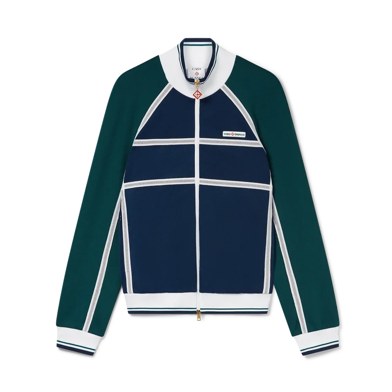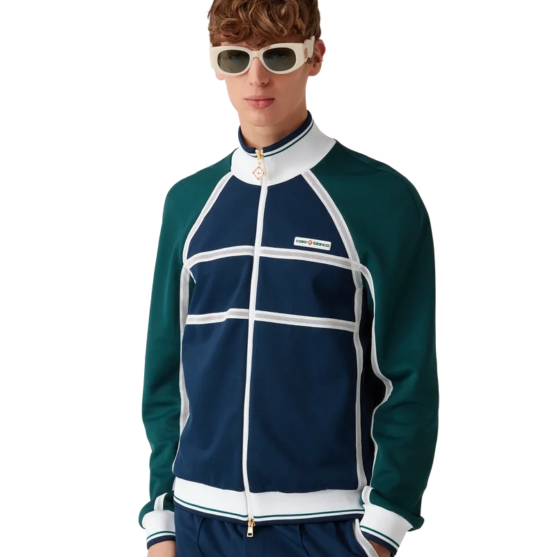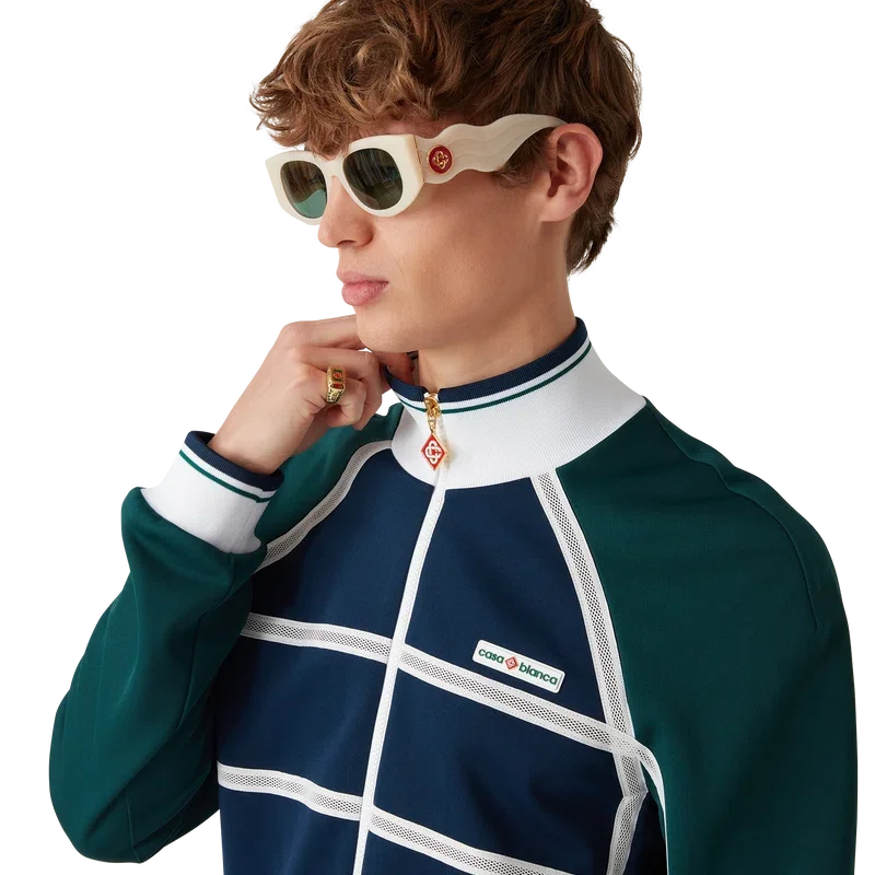 Die Mesh Tape Trainingsjacke ist ein von Sportbekleidung inspiriertes Design aus Trikotstoff. Mit Reißverschluss, Einsätzen mit weißen Paspeldetails, geripptem Kragen, Ärmelbündchen und Saum mit Streifendetails, Seitentaschen, Mesh-Band-Detail und dem charakteristischen Casablanca-Logo des Hauses.