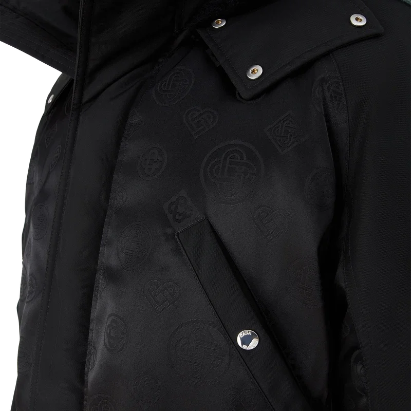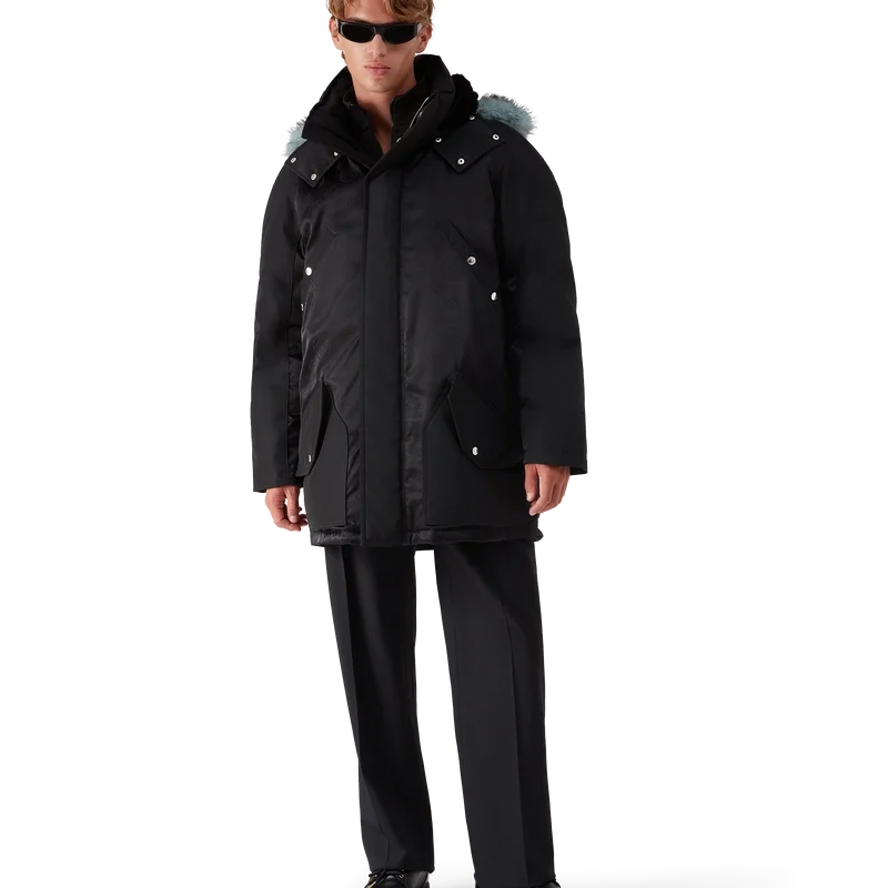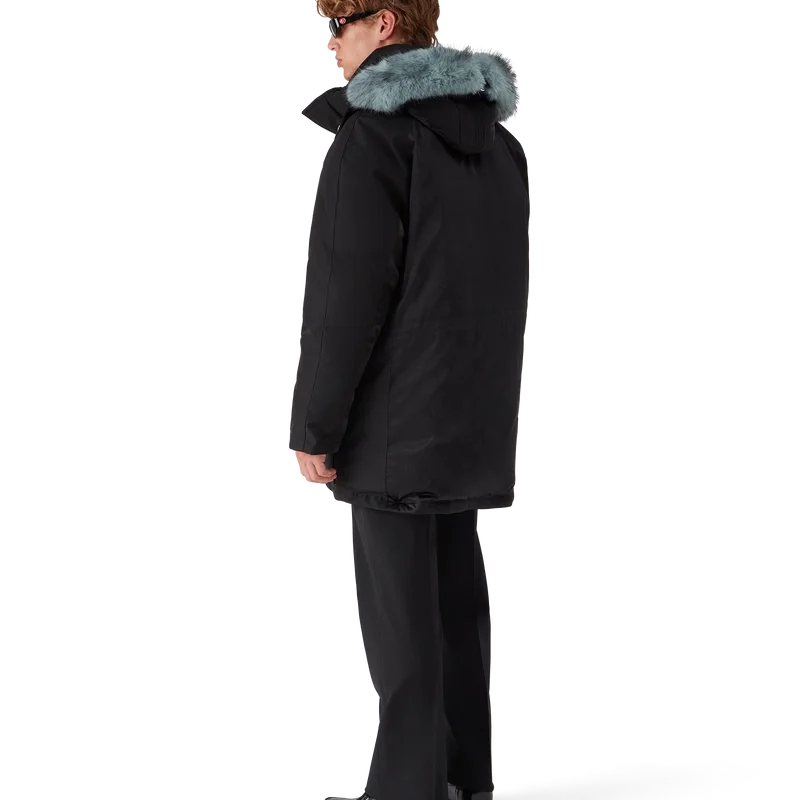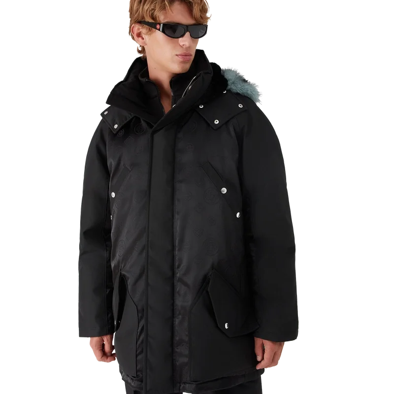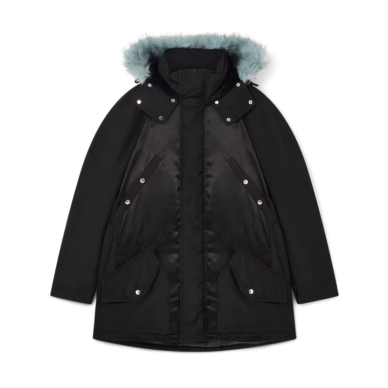 Der Nylon-Parka ist ein Modell der Oberbekleidung aus Monogram-Nylongewebe mit dem Honeydew-Print des Hauses auf einem technischen Schwarz-auf-Schwarz-Stoff. Er verfügt über eine abnehmbare Kapuze mit Kunstfellbesatz, Kordelzug, Reißverschluss, Brusttaschen und aufgesetzte Taschen mit Markenbeschlägen sowie innenliegende Strickbündchen.