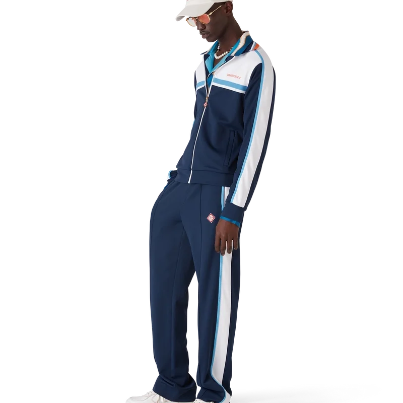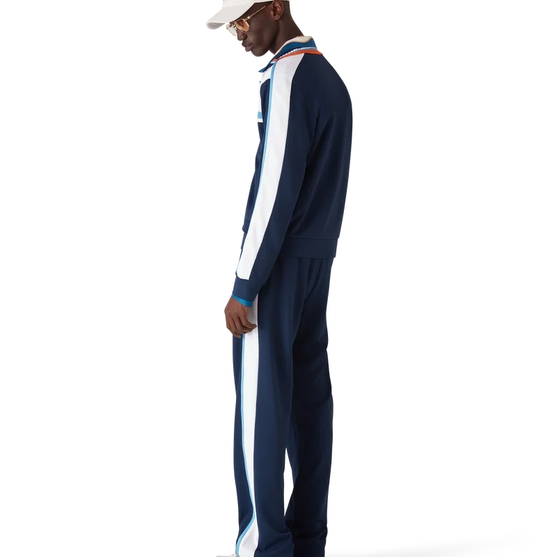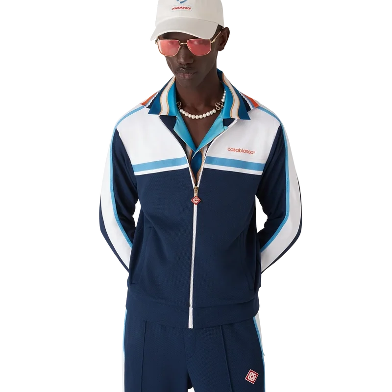 Die Piqué-Trainingsjacke ist ein klassisches Sportbekleidungsdesign aus rundem Piqué-Stoff. Mit geripptem Kragen, farblichen Blöcken in Marineblau und Weiß, Streifendetails über der Brust, Reißverschluss, gerippten Bündchen und Saum sowie einem Netzfutter.