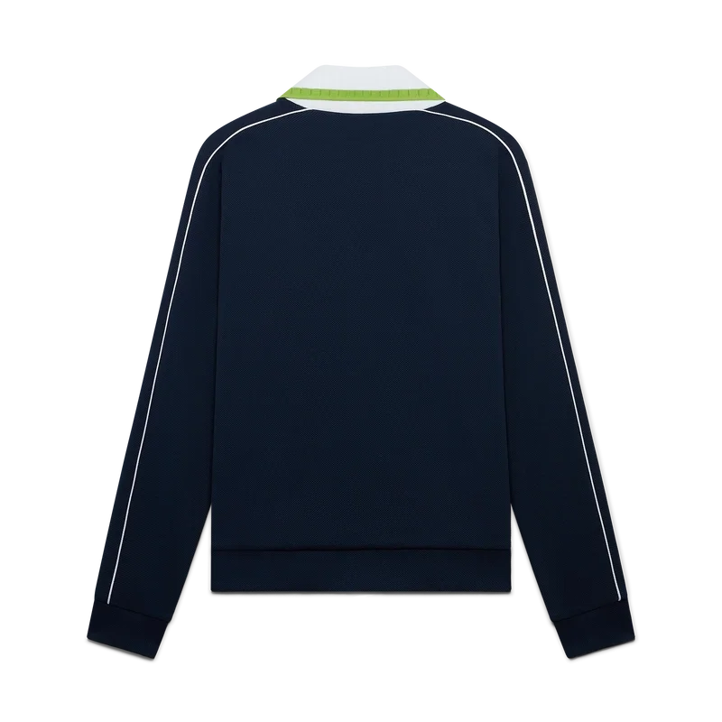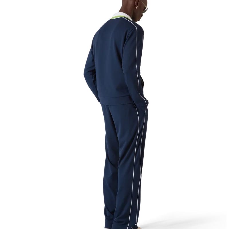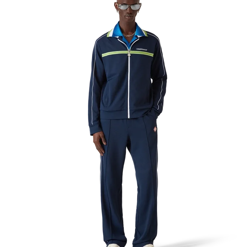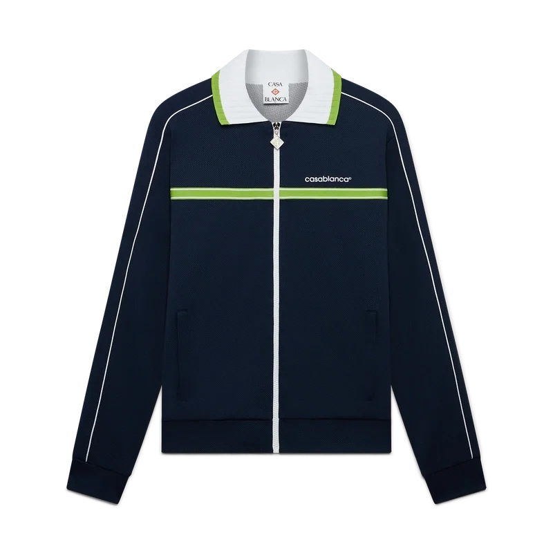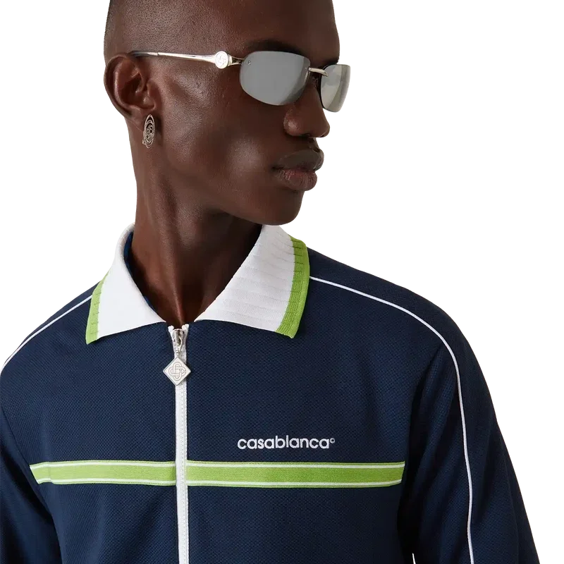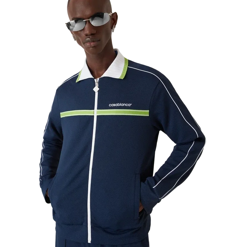 Die Piqué-Trainingsjacke ist ein klassisches Sportbekleidungsdesign mit langen Ärmeln und dem „Casablanca“-Logo des Hauses. Sie verfügt über einen Reißverschluss mit dem charakteristischen Rautenlogo des Hauses auf dem Reißverschlussschieber, einen gerippten Kragen, grün-weiße Streifenverzierungen auf der Brust, Paspelverzierungen an den Schultern und entlang der Ärmel, ein Futter sowie gerippte Säume und Bündchen. Marineblau