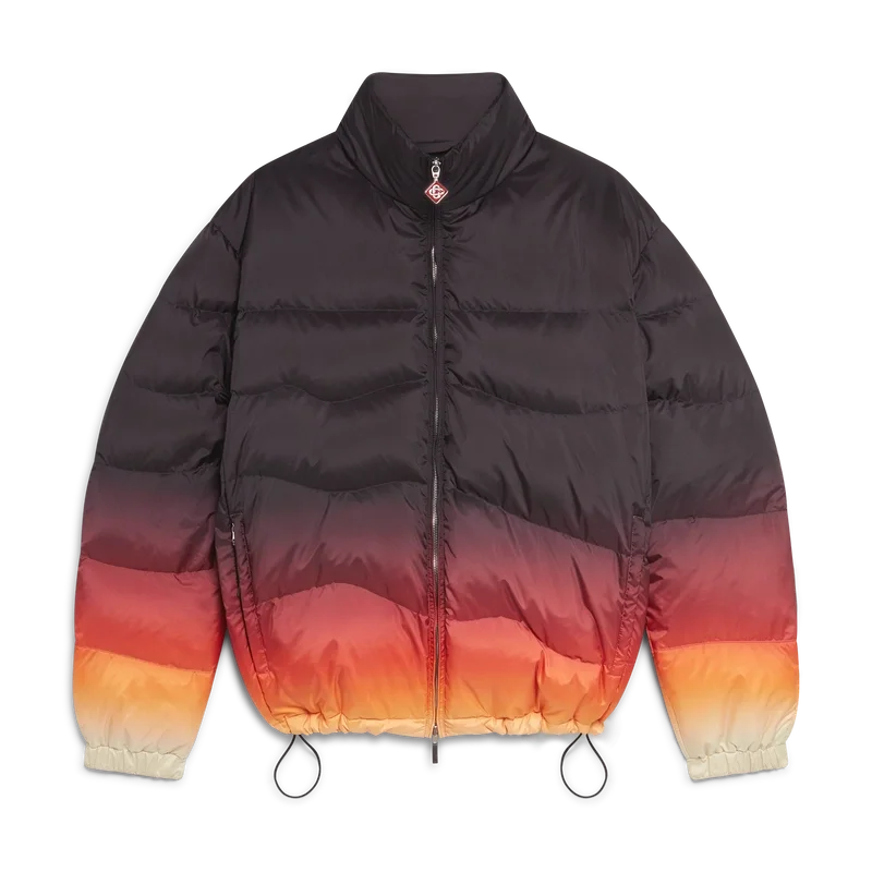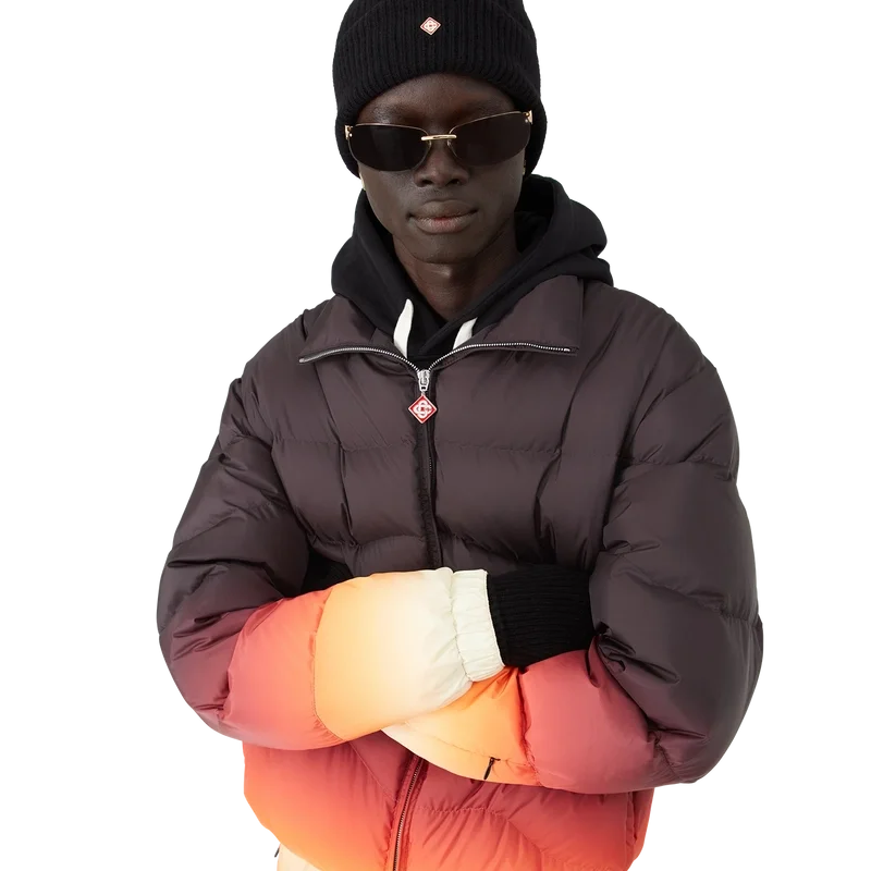 Die Ski-Pufferjacke ist ein raffiniertes Design der Oberbekleidung aus gradientenbedrucktem, gestepptem Daunenstoff mit einem mehrfarbigen Farbverlauf, inspiriert von dramatischen Sonnenuntergängen über Japans schneebedeckten Bergketten. Sie greift atemberaubende Momente auf, in denen sich der Himmel über ländlichen Winterlandschaften in leuchtende Farben verwandelt. Abgerundet durch einen Reißverschluss mit dem charakteristischen Diamant-Logo-Reißverschlusszug des Hauses, Fronttaschen mit Reißverschluss, eine Skipass-Tasche am linken Ärmel sowie einen elastischen Saum und elastische Bündchen.