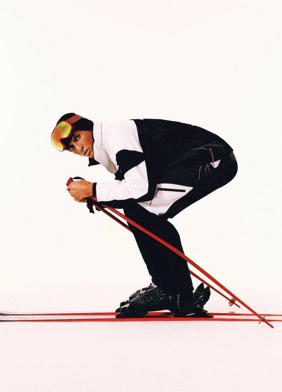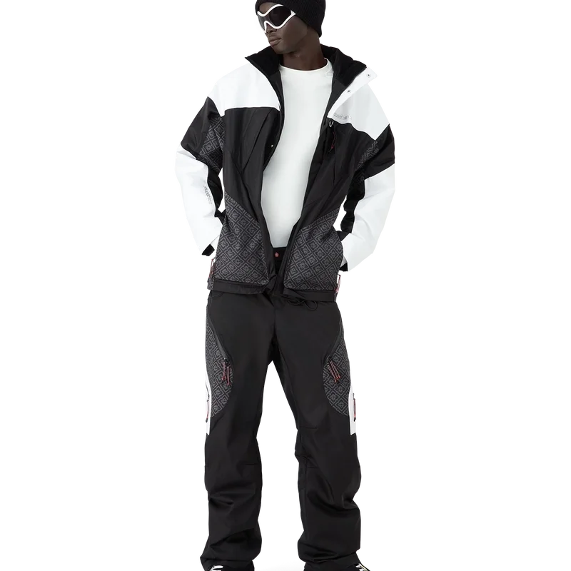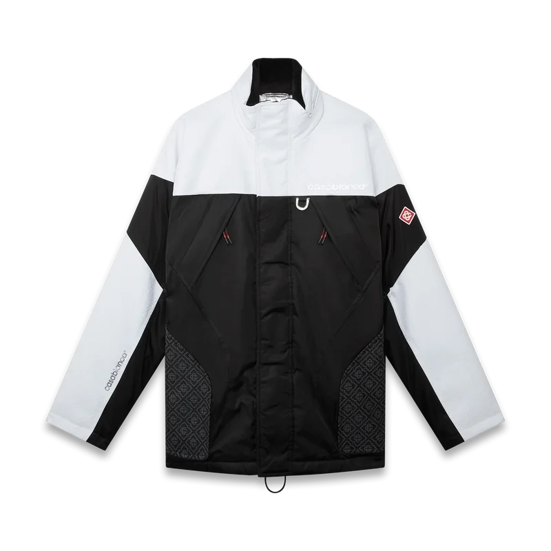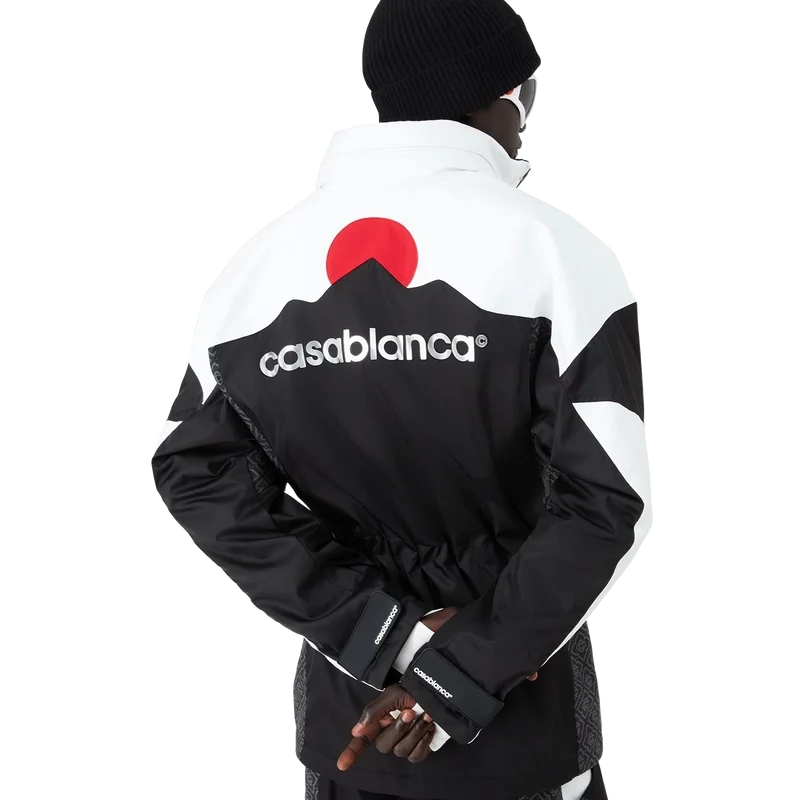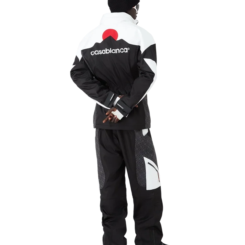 Die Skijacke ist ein raffiniertes Design der Oberbekleidung aus Ripstop-Stoff in Schwarz und Weiß mit kontrastierendem Monogramm, inspiriert von der grafischen Schönheit der japanischen Winterlandschaft, in der traditionelle Muster durch die schneebedeckten Landschaften widerhallen. Sie greift die rhythmische Geometrie der ländlichen Architektur und den kühnen Kontrast dunkler Holzkonstruktionen vor leuchtenden Schneefeldern auf. Ausgestattet mit Reißverschluss, aufgesetzten Taschen mit Reißverschluss und elastischen Reißverschlusslaschen, versilberten Beschlägen und Reißverschlussverschlüssen an den Knöcheln.