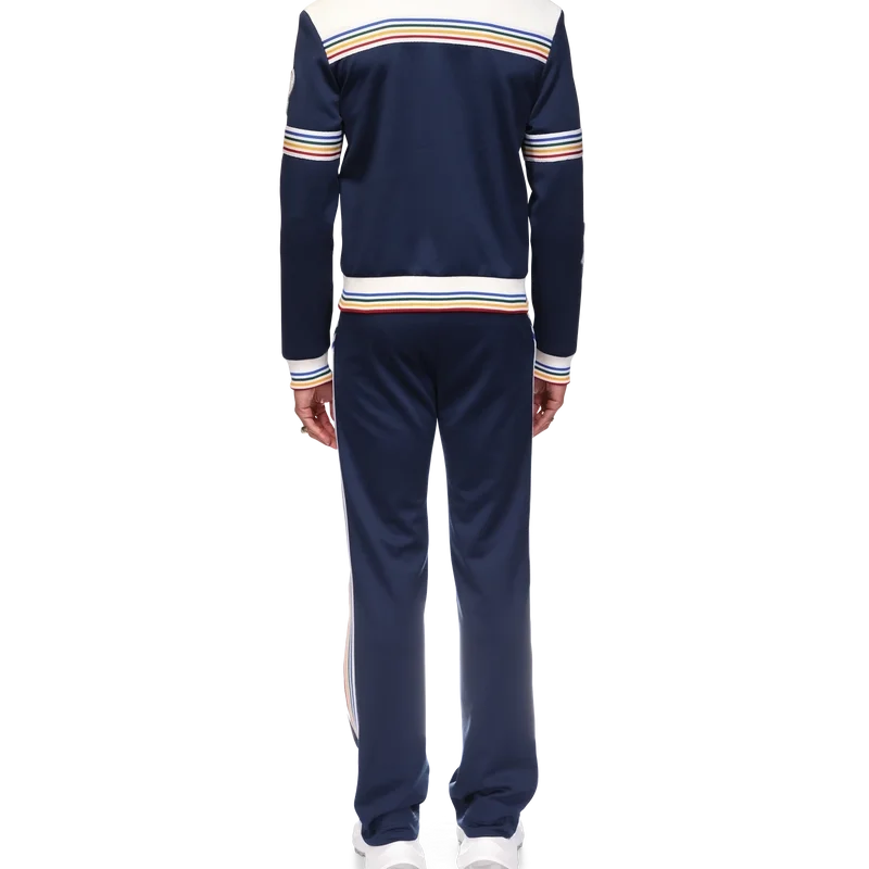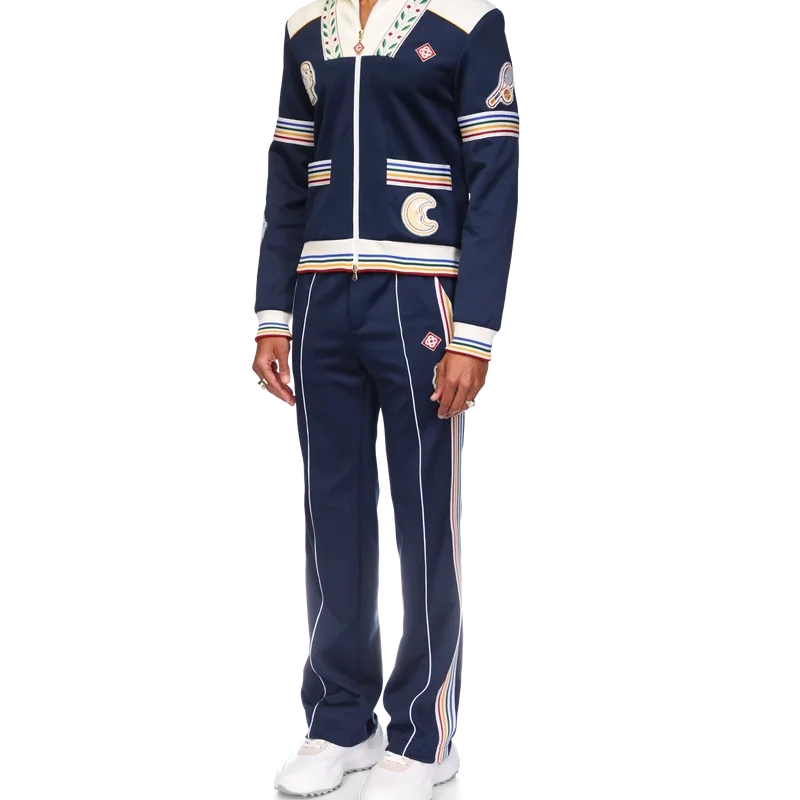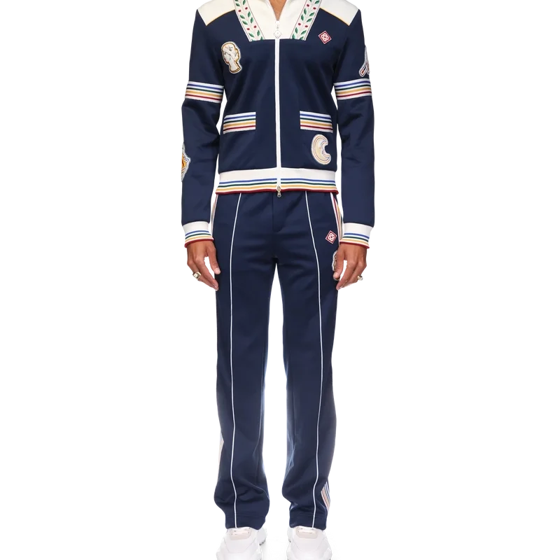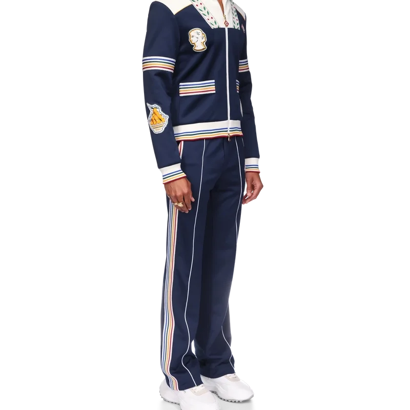 Die Varsity-Trainingsjacke ist ein langärmeliges Modell aus Trikotstoff mit dem charakteristischen Rautenlogo des Hauses. Mit Reißverschluss, griechischen Motiven, Tennis-Motiven, orangefarbener Pyramide, Mond, mehrfarbigem Streifenband an Ärmeln, Rücken und Taschen, mehrfarbigen gerippten Bündchen, sowie Details an Kragen und Saum, kontrastierenden gerippten Kragen und Schultern und ein Mesh-Futter