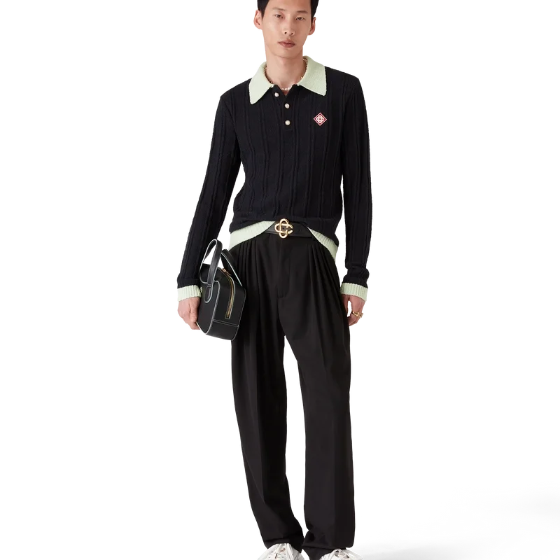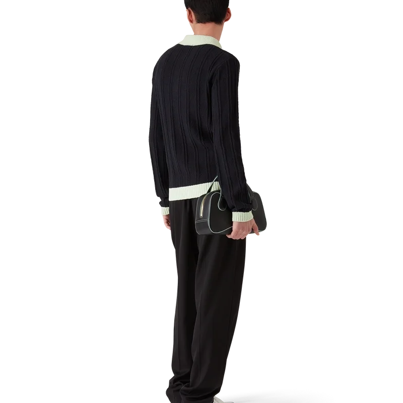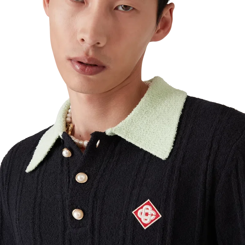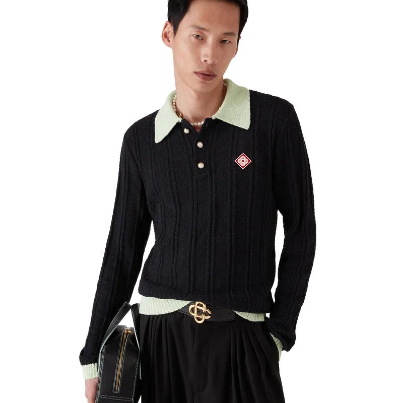 Das Bouclé-Poloshirt mit langen Ärmeln ist ein Modell aus Bouclé-Baumwollstoff. Es verfügt über einen Knopfverschluss sowie einen kontrastierenden Kragen, Ärmelbündchen und Saum aus Rippstrick.