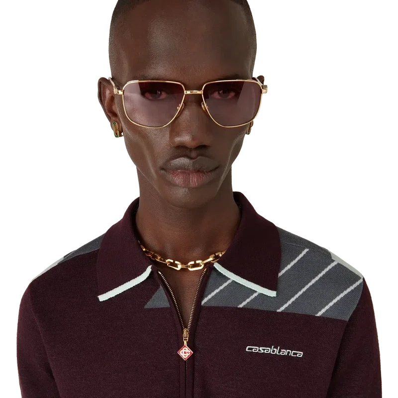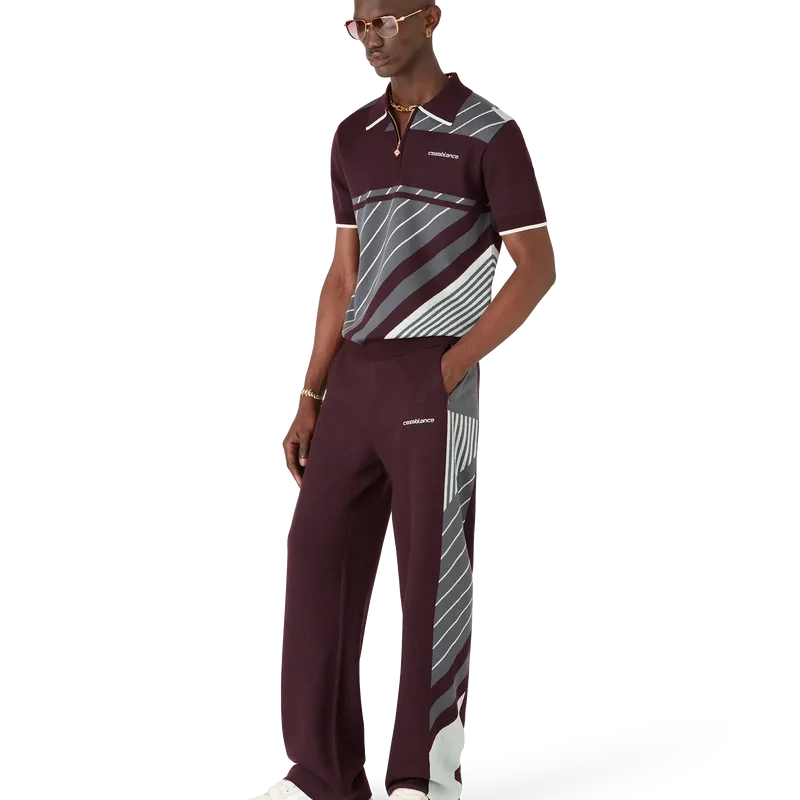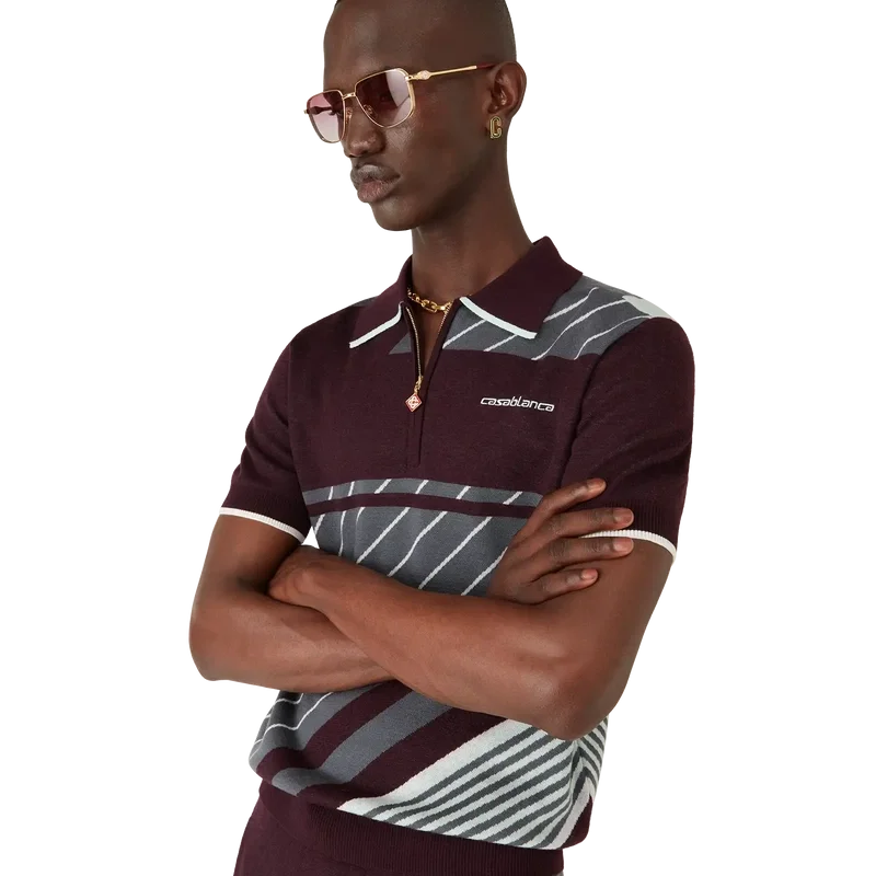 Das Merino Diagonal Tennis Poloshirt ist ein gestricktes Kurzarm-Modell mit diagonalen Sportstreifen und einem gestickten Casablanca-Logo. Abgerundet durch einen Viertelreißverschluss mit charakteristischer Reißverschlusslasche mit Diamant-Logo, einen gerippten Kragen sowie kontrastfarbene Kanten an Kragen und Ärmelbündchen