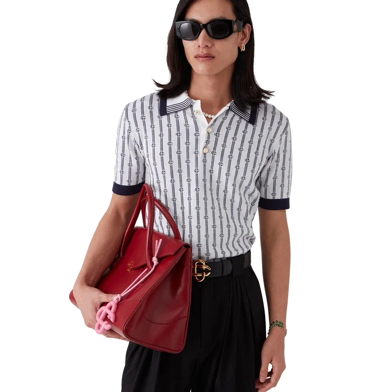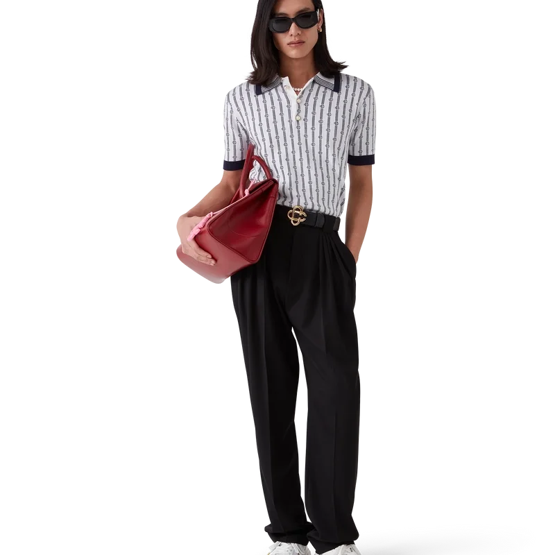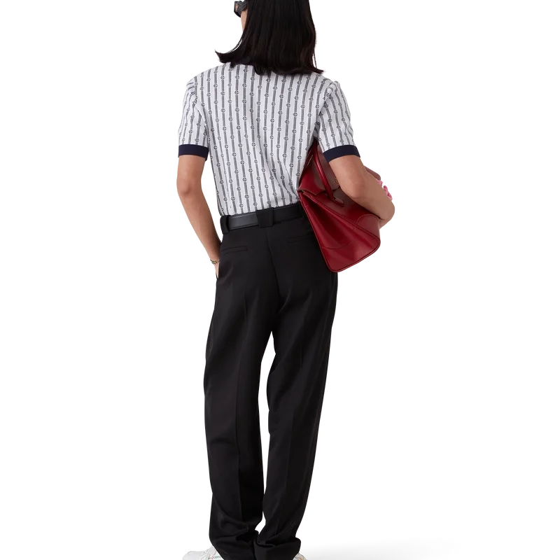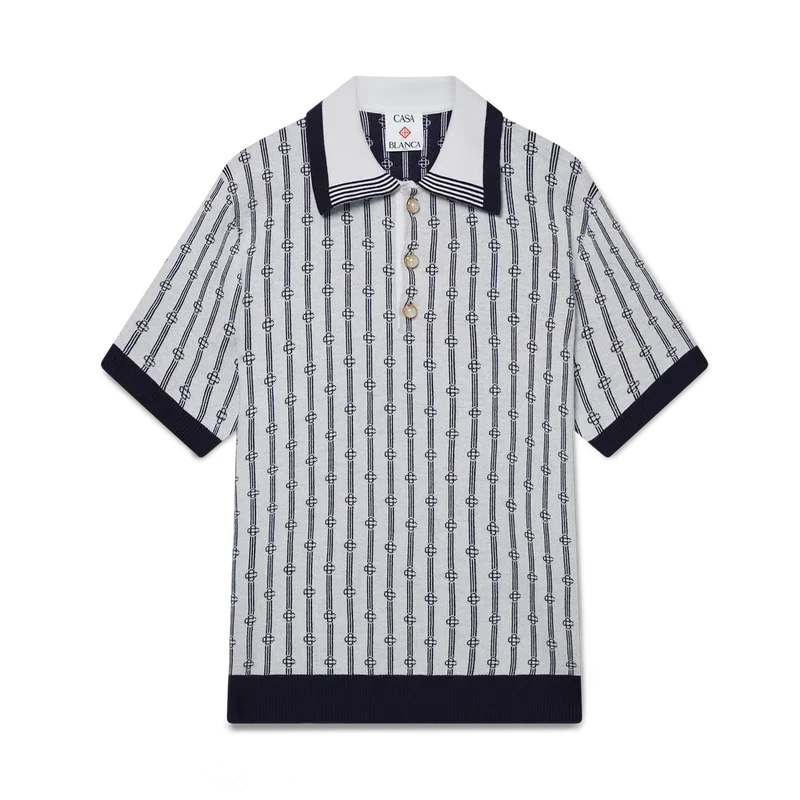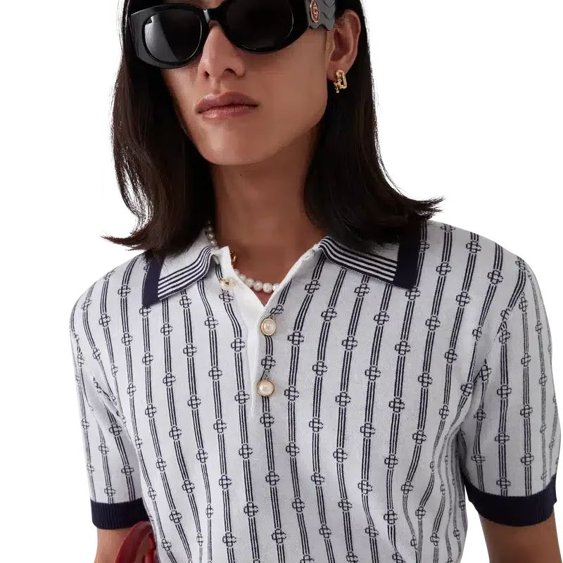 Das Monogram-Poloshirt ist ein kurzärmeliges Modell aus einem Baumwollmischgewebe mit einer klassischen Knopfleiste mit drei Knöpfen. Abgerundet wird es durch die charakteristischen, goldumrandeten Perlknöpfe des Hauses sowie gerippte Manschetten, Saum und Kragen mit Kantenverzierung.