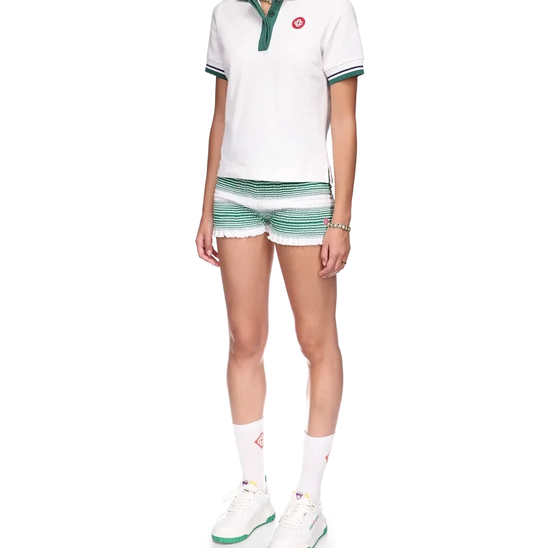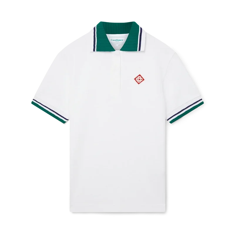 Das Piqué-Poloshirt ist ein kurzärmeliges Modell in klassischer Silhouette mit dem charakteristischen Diamant-Logo-Aufnäher des Hauses. Hergestellt aus einem Piqué-Stoff aus Bio-Baumwolle, mit kontrastierenden Details an Kragen und Manschetten, einer Knopfleiste mit drei Knöpfen und einem Casablanca-Markenlabel