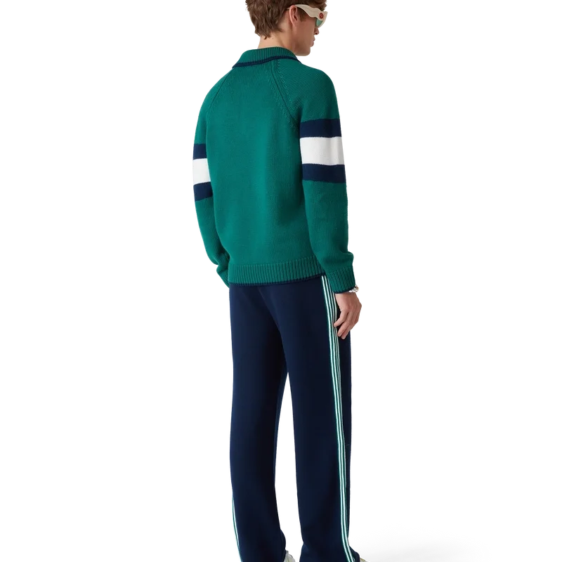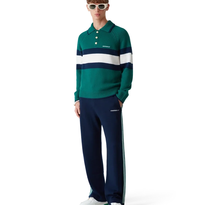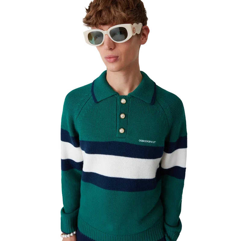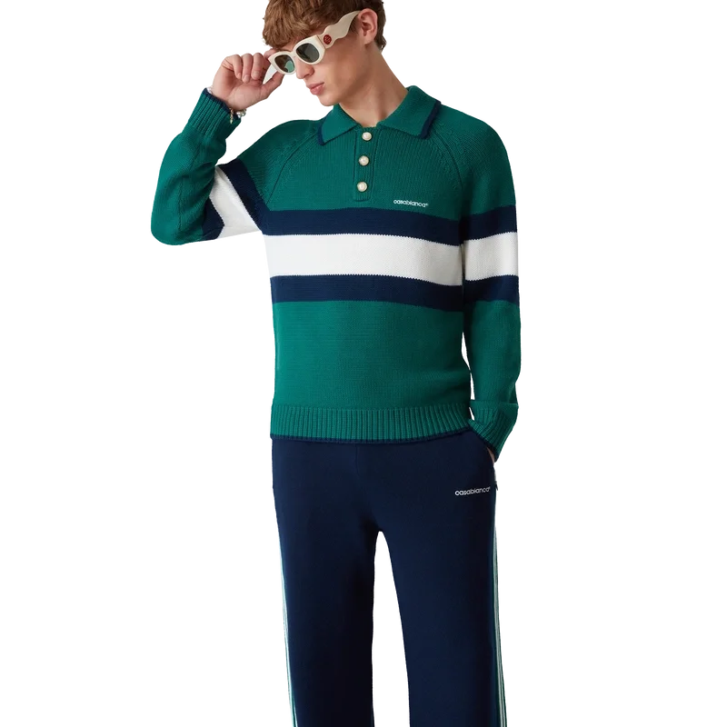 Das Colourblock-Poloshirt ist ein langärmeliges Modell aus Merinowolle und verfügt über einen blau-weißen Streifen über Brust und Rücken. Abgerundet wird es durch Raglanärmel, gerippte Bündchen, Saum und Kragen, charakteristische goldgerahmte Perlknöpfe und das Casablanca-Logo.