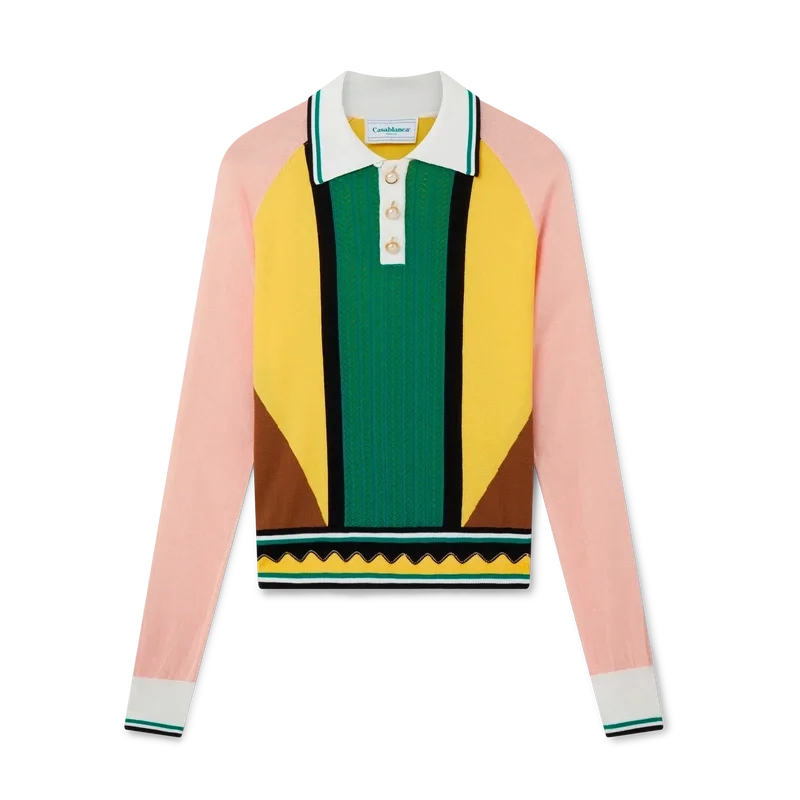 Das Poloshirt mit grafischen Einsätzen ist ein langärmeliges Design, das von Nigeria inspiriert ist und die Farben der Landesflagge aufgreift. Abgerundet wird es durch farbige Einsätze, die für das Haus typischen goldenen Perlenknöpfe, einen gerippten Kragen sowie Manschetten und Saum mit gestreiften Details.<!–