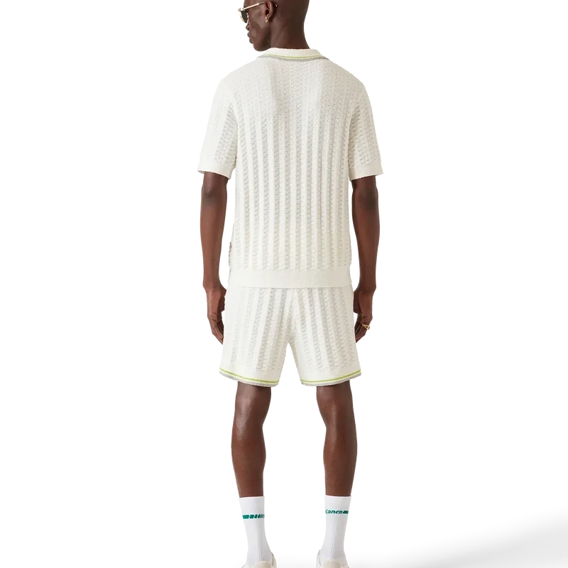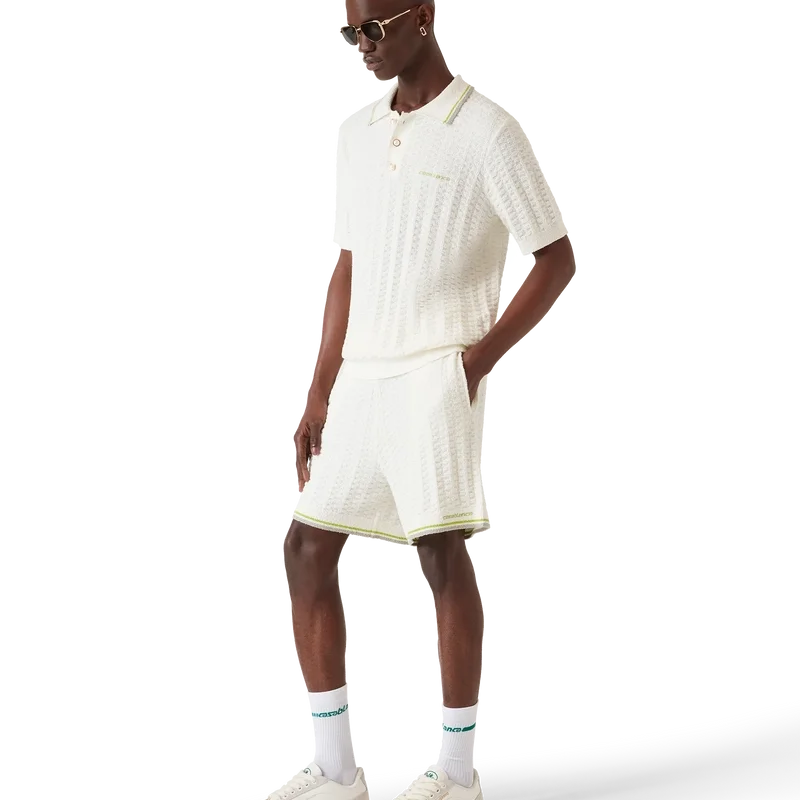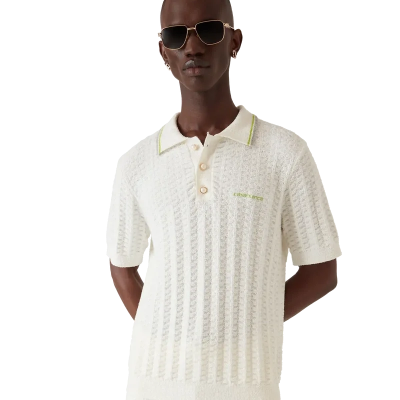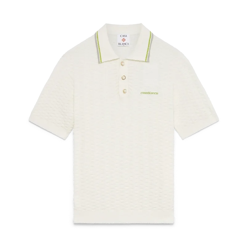 Das Tennis-Bouclé-Poloshirt ist ein kurzärmeliges Modell mit Struktur und dem Casablanca-Logo des Hauses. Abgerundet wird es durch das charakteristische Casablanca-Logo des Hauses, eine Knopfleiste mit drei Knöpfen, goldgeränderte Perlmuttknöpfe sowie gerippte Details an Kragen, Ärmelbündchen und Saum.