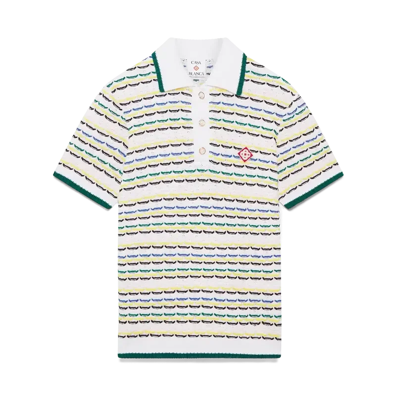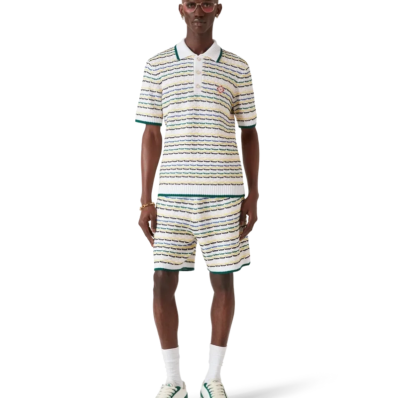 Das Tuck-Stitch-Poloshirt mit kurzen Ärmeln ist ein Strickmodell mit dem charakteristischen Rautenlogo des Hauses. Abgerundet durch einen Knopfverschluss, charakteristische goldgeränderte Perlmuttknöpfe sowie gerippten Kragen, Manschetten und Saum mit Kantenverzierung.