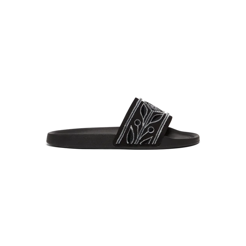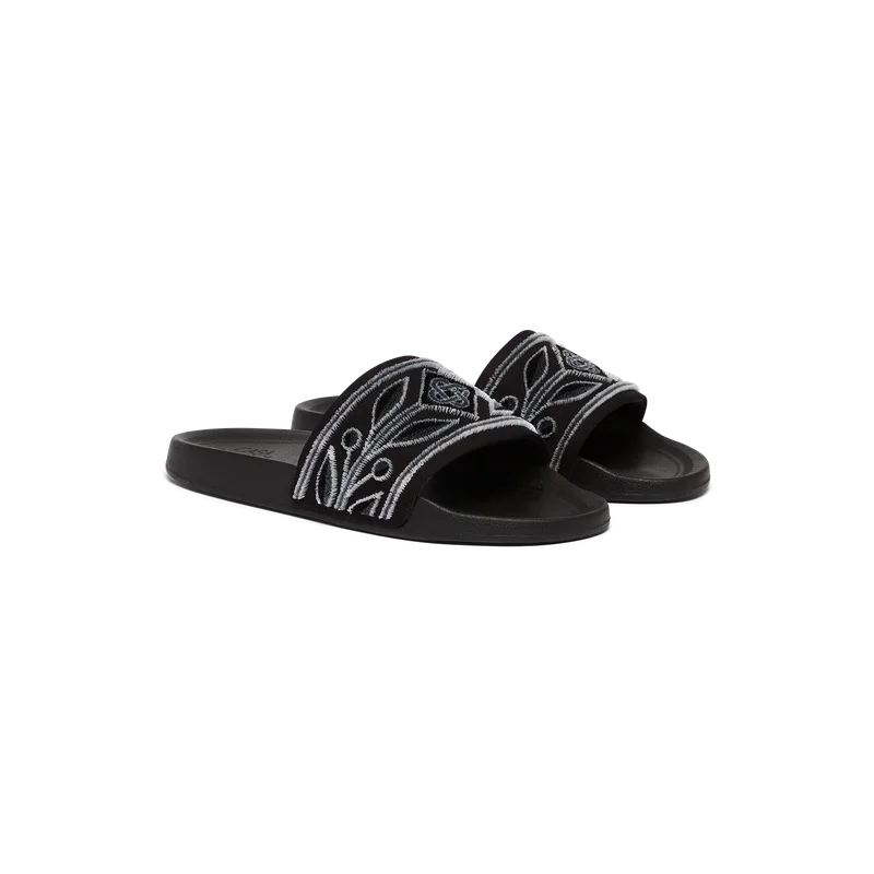 Die Pool-Slides sind aus besticktem Frottee gefertigt und zieren auf dem Obermaterial das Diamond-Logo sowie das charakteristische Lorbeer-Motiv des Hauses. Abgerundet werden sie durch ein geformtes Fußbett für erhöhten Komfort und eine strukturierte, gummierte Sohle, die Funktionalität mit Freizeitlook verbindet.