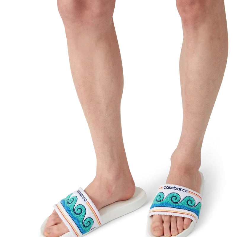 Die Greco-Wave Terry Sliders sind aus besticktem Frottee gefertigt und zieren auf dem Obermaterial das saisonale Motiv des Hauses. Abgerundet durch gepolsterte, gummilike Sohlen.