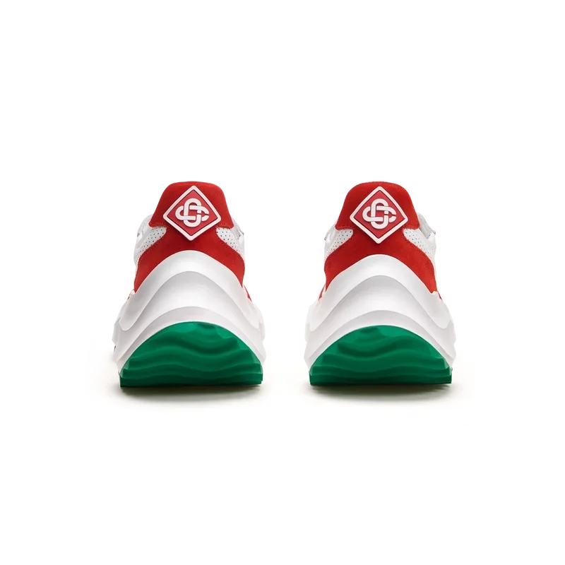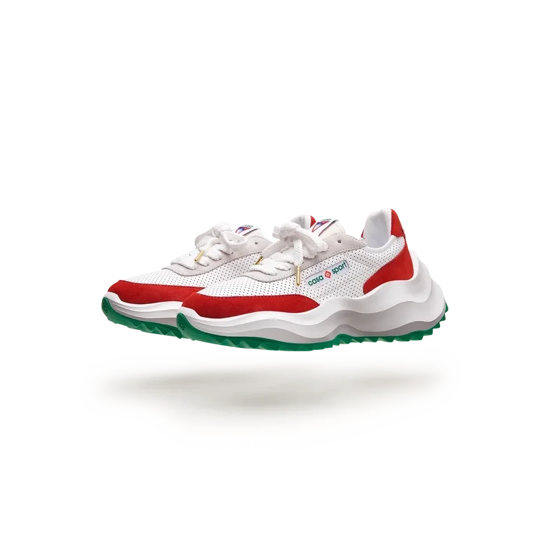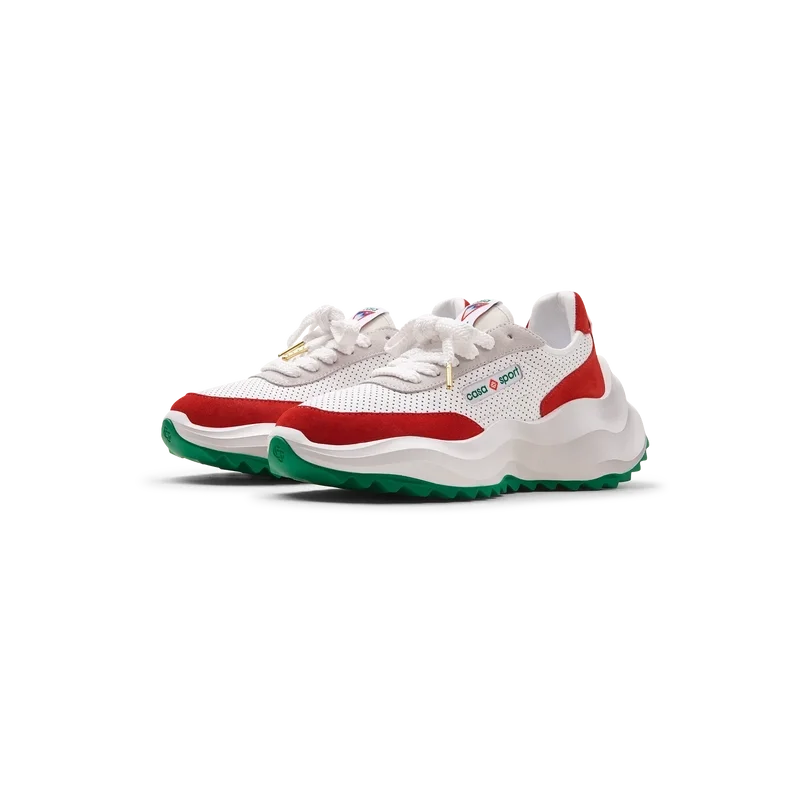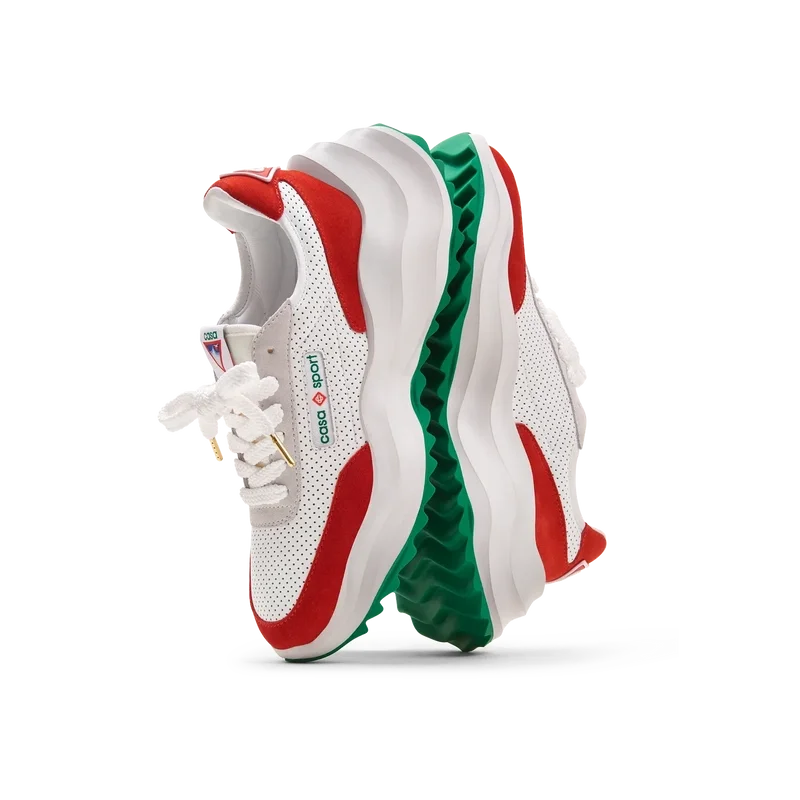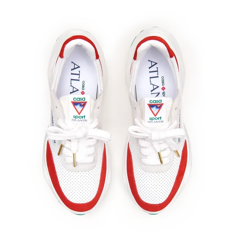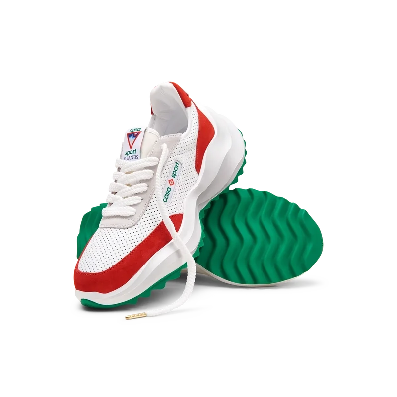 Farblich abgestimmte rote Wildleder-Overlays, perforiertes Obermaterial aus Leder, kontrastierende Wildleder-Schnürsenkelhalterung, Casablanca-Diamant-Gummipatch mit Markenlogo an der Fersenlasche, gewebte Casa Sport-Fensterlasche mit Markenlogo an der Seitenwand, gewebtes Atlantis-Zungenlabel, geformte EVA-Wave-Zwischensohle, Gummi-Außensohle, goldene Schnürsenkelenden