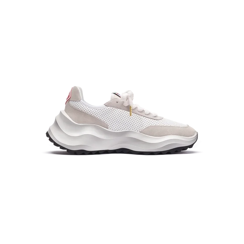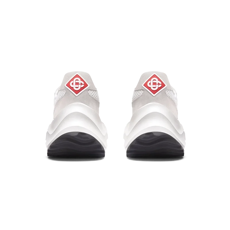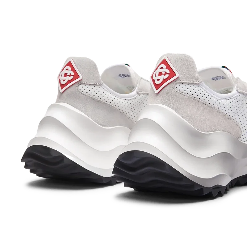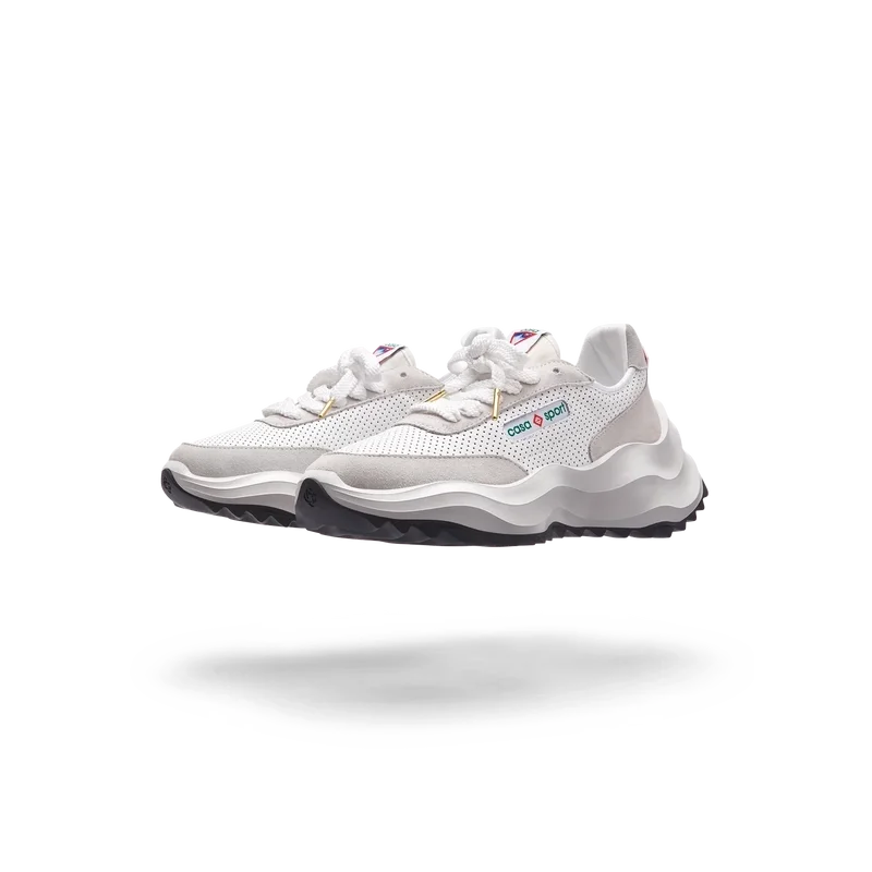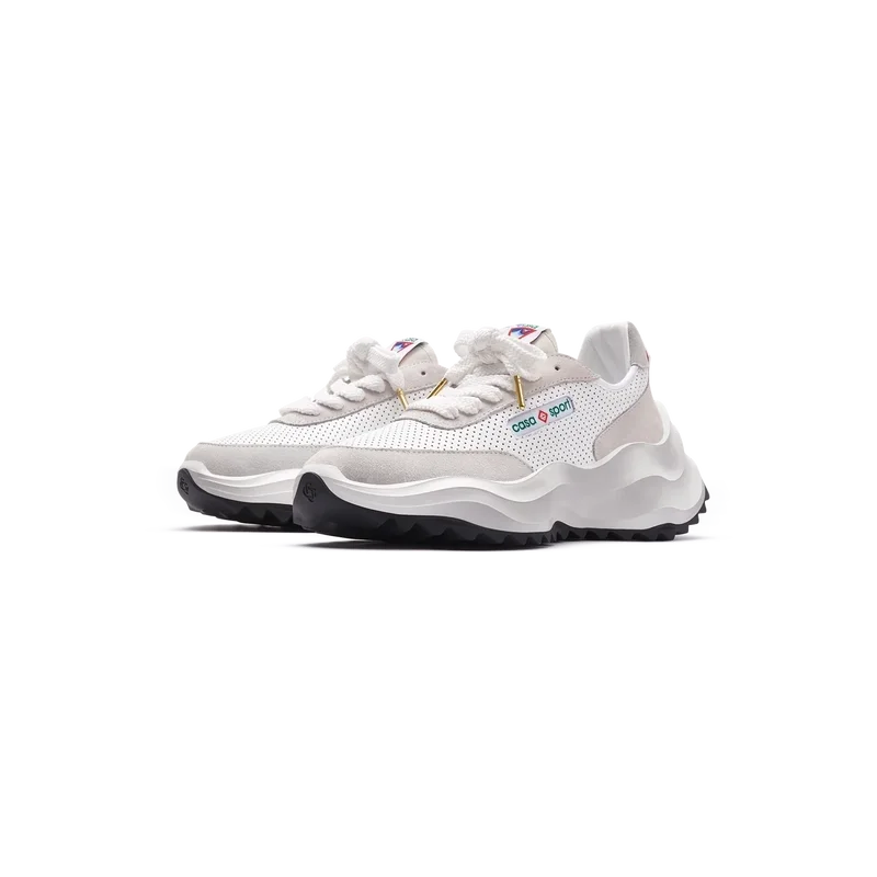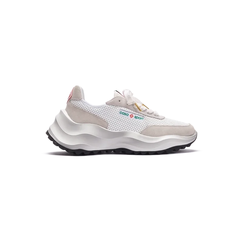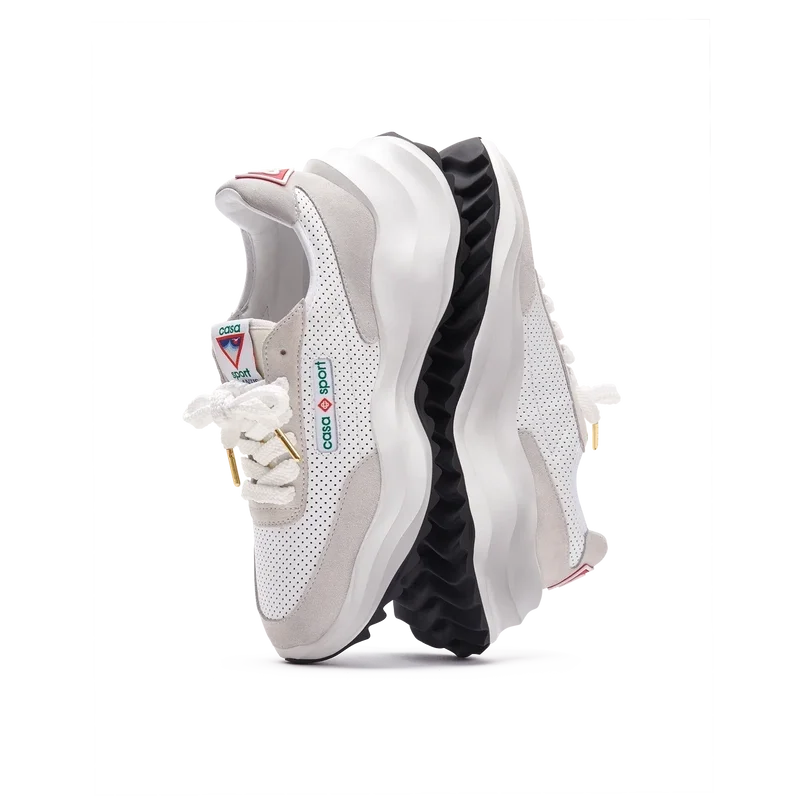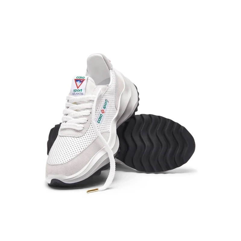 Farblich abgestimmtes Off-WhiteOverlays aus Wildleder, Obermaterial aus perforiertem Leder, kontrastierende Schnürsenkel aus Wildleder, Casablanca-Diamant-Gummipatch auf der Fersenlasche, gewebte Casa Sport-Fensterlasche mit Markenlogo an der Seitenwand, gewebtes Atlantis-Zungenlabel, geformte EVA-Wave-Zwischensohle, Gummi-Außensohle, goldene Schnürsenkelenden