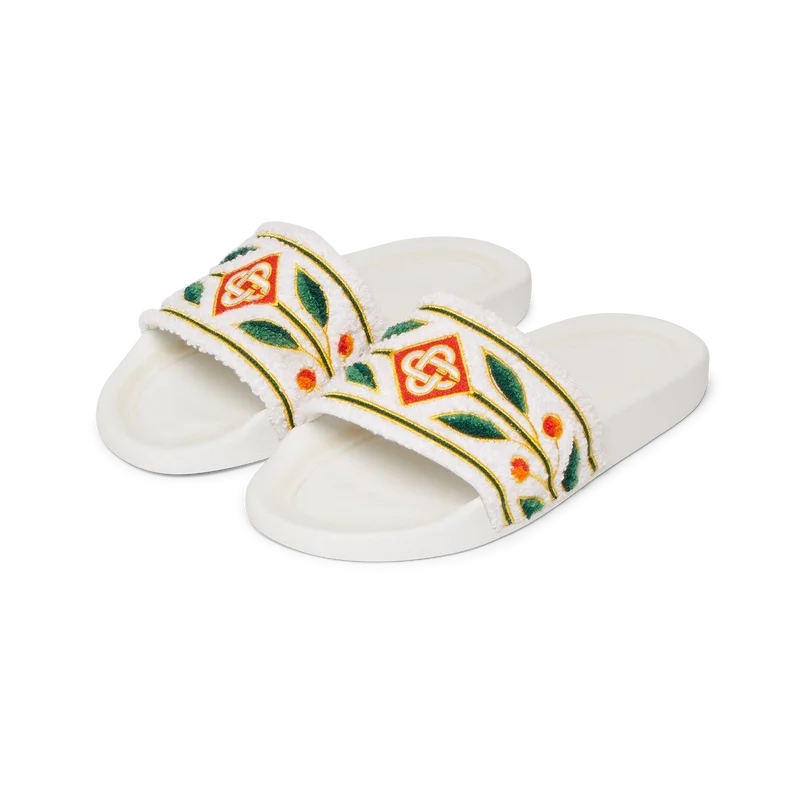 Die bestickten Herren-Slipper aus Frottee sind aus Frottee gefertigt und zieren das Diamant-Logo des Hauses sowie das charakteristische Lorbeer-Motiv auf dem Obermaterial. Abgerundet werden sie durch ein geformtes Fußbett für erhöhten Komfort und eine strukturierte gummierte Sohle, die Funktionalität mit Freizeitlook verbindet.