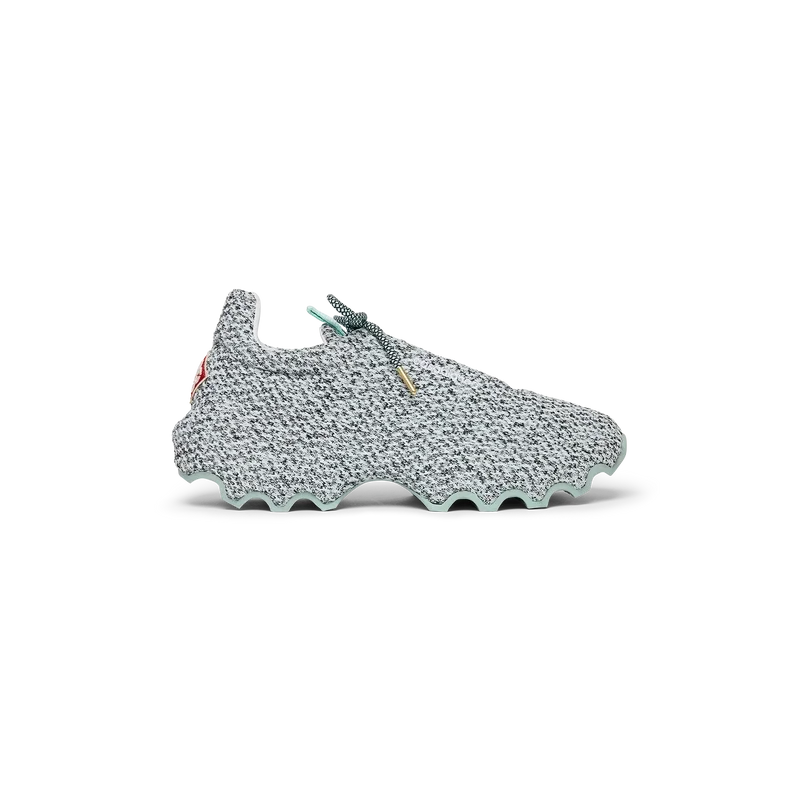 Inspiriert von der zeitlosen Symbolik architektonischer Stärke führt der Arch Sneaker eine neue Designsprache ein, die auf Form, Fluss und Bedeutung basiert. Ausgehend von Casablancas charakteristischen Designcodes ist der Arch eine skulpturale Interpretation von Stabilität und Bewegung – ein zukünftiger Klassiker, der in struktureller Schönheit verwurzelt ist. Die Sohle weist ein zentrales Bogenmotiv auf, wobei kleinere Bögen über die gummierte Basis verlaufen und am Übergang zwischen Sohle und Obermaterial einen Welleneffekt bilden – ein visueller Rhythmus, der sowohl auf technische Formgebung als auch auf natürliche Bewegung anspielt. Das Obermaterial besteht aus einer Mischung aus atmungsaktivem Textil und veganem Leder und fließt nahtlos über die Kanten der Sohle, wodurch eine durchgehende, skulpturale Silhouette entsteht. Der Bogen wird durch eine Schnürung gesichert und mit dem emblematischen Diamant-Logo des Hauses auf einem Silikon-Patch an der Zunge verziert, während das Casablanca-Branding elegant entlang der Seitenkante verläuft und Schnürsenkel und Zunge zu einer einzigen Linie der gestalterischen Kontinuität vereint. Zusammen bieten diese Elemente einen modernen Ausdruck von Balance – Stärke durch Weichheit, Struktur durch Bewegung.