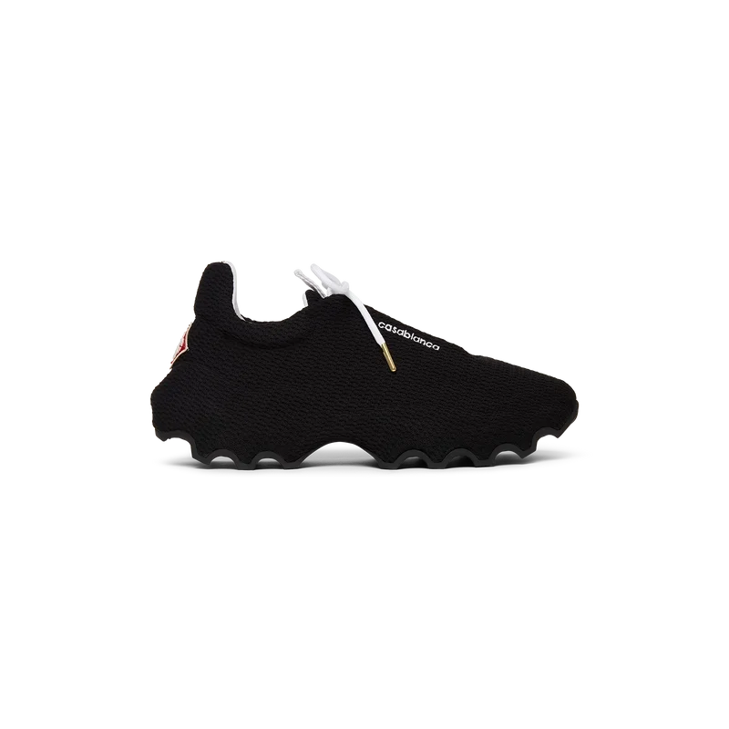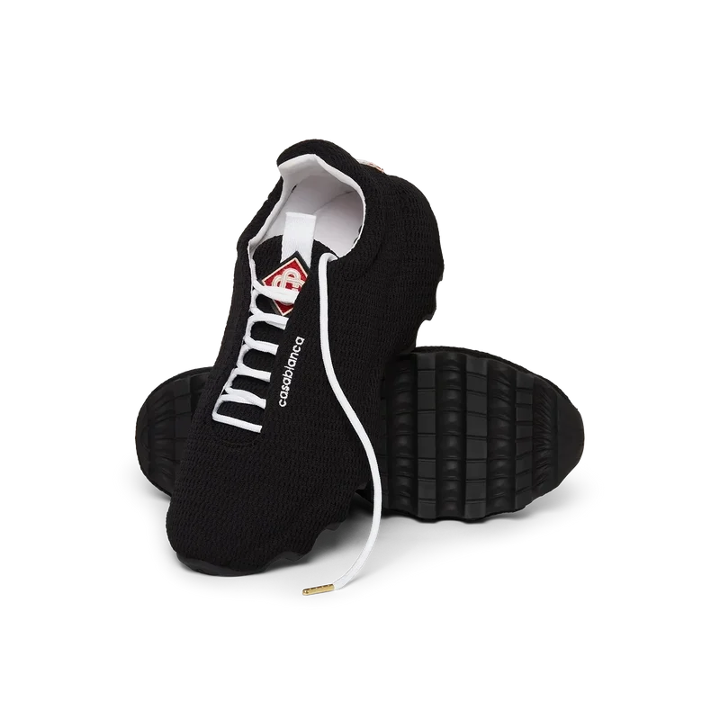 Inspiriert von der zeitlosen Symbolik architektonischer Stärke führt der Arch Sneaker eine neue Designsprache ein, die auf Form, Fluss und Bedeutung basiert. Der Arch greift die charakteristischen Designcodes von Casablanca auf und ist eine skulpturale Interpretation von Stabilität und Bewegung – ein zukünftiger Klassiker, der in struktureller Schönheit verwurzelt ist. Die Sohle weist ein zentrales Bogenmotiv auf, wobei kleinere Bögen über die gummierte Basis verlaufen und am Übergang zwischen Sohle und Obermaterial einen Welleneffekt bilden – ein visueller Rhythmus, der sowohl auf technische Formgebung als auch auf natürliche Bewegung anspielt. Das Obermaterial besteht aus einer Mischung aus atmungsaktivem Textil und veganem Leder und fließt nahtlos über die Kanten der Sohle, wodurch eine durchgehende, skulpturale Silhouette entsteht. Der Bogen wird durch einen Schnürverschluss gesichert und mit dem emblematischen Diamant-Logo des Hauses auf einem Silikon-Patch an der Zunge verziert, während das Casablanca-Branding elegant entlang der Seitenkante verläuft und Schnürsenkel und Zunge zu einer einzigen Linie der gestalterischen Kontinuität vereint. Zusammen bieten diese Elemente einen modernen Ausdruck von Balance – Stärke durch Weichheit, Struktur durch Bewegung.