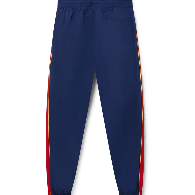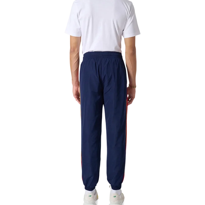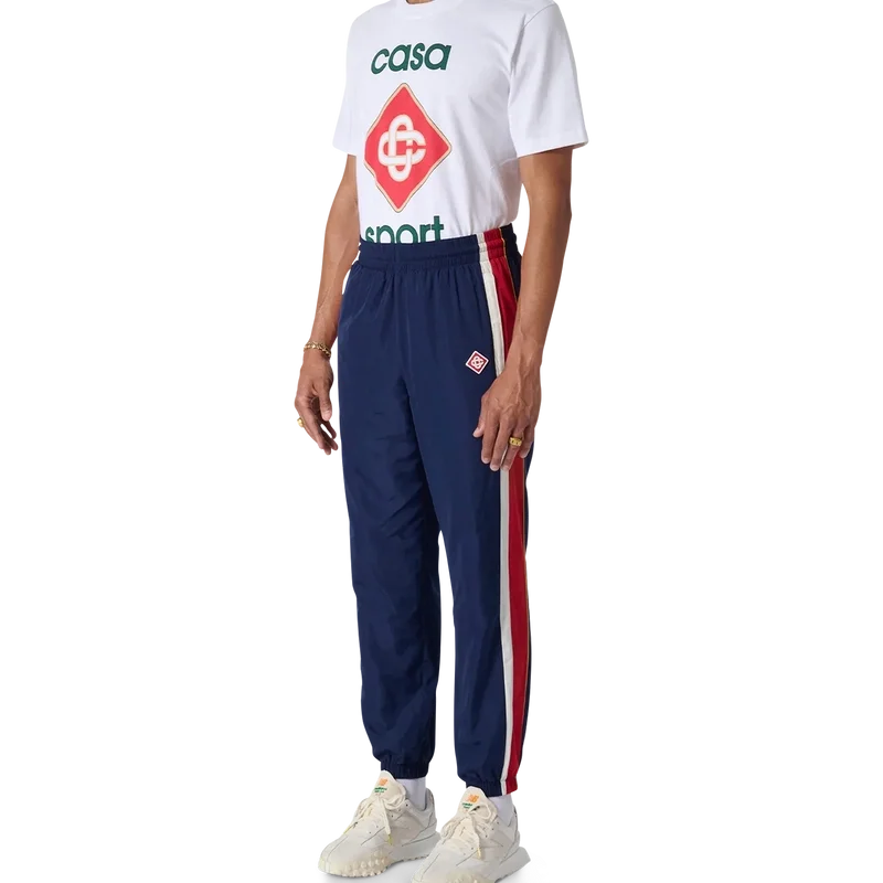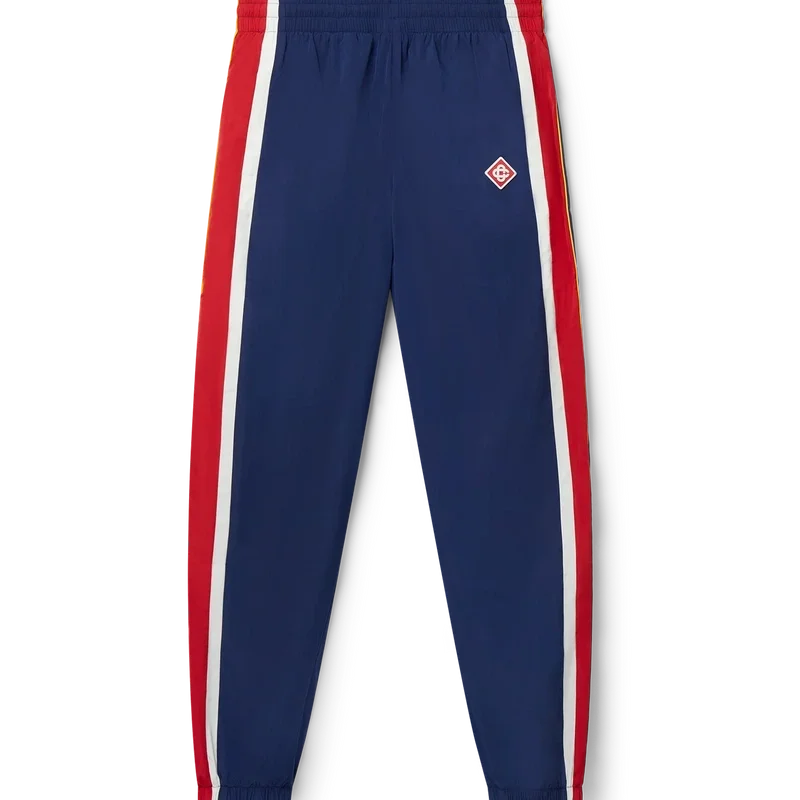 Die Arch Panelled Shell Trainingshose ist eine nostalgische Sporthose aus Polyester-Taft mit Einsätzen in Weiß, Rot und Marineblau. Mit goldfarbenen Kordelzügen, elastischen Bündchen und Seitentaschen. Klassische Passform mit gesticktem Casablanca Paris Diamond Monogram-Logo auf dem linken Bein.