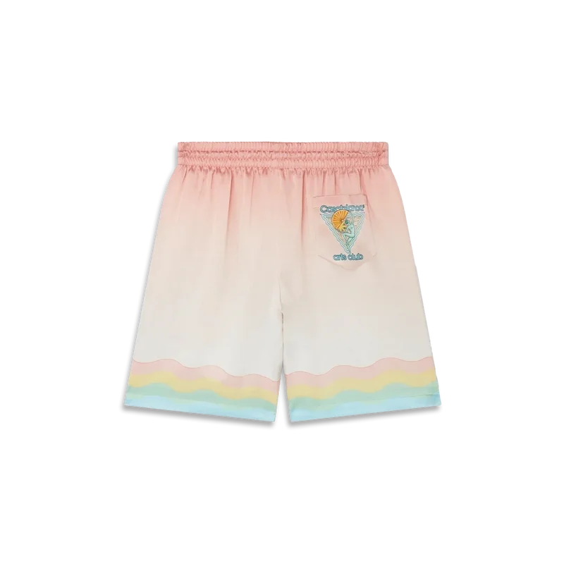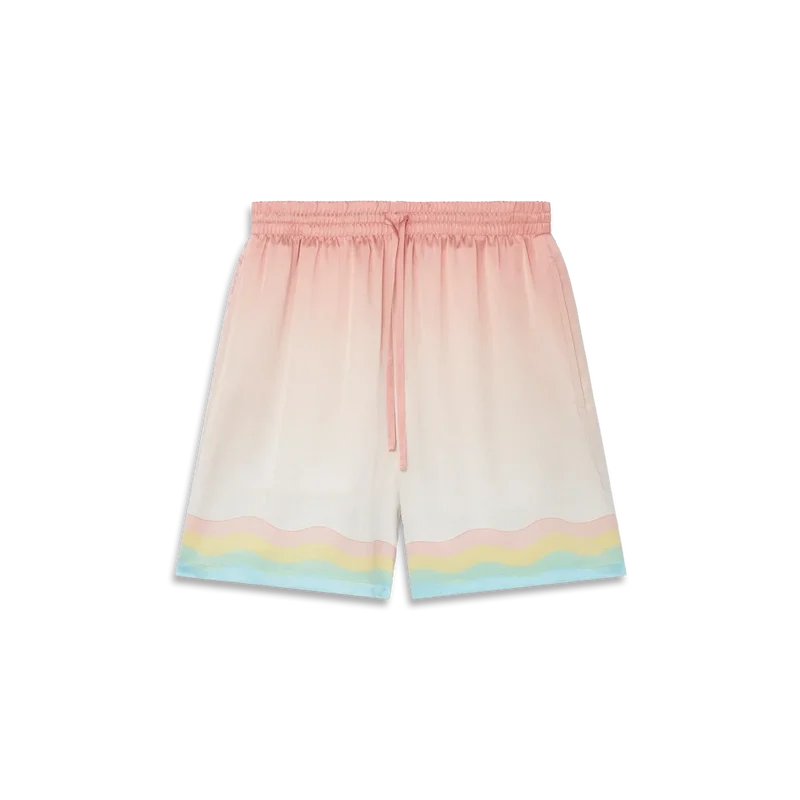 Die Arts Club Seidenshorts in einem rosa Ombré-Farbverlauf mit saisonalem Kunstdruck. Mit elastischem Bund, Kordelzug und seitlichen sowie hinteren Taschen, die locker bis über das Knie reichen.