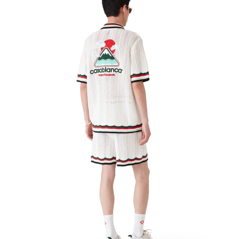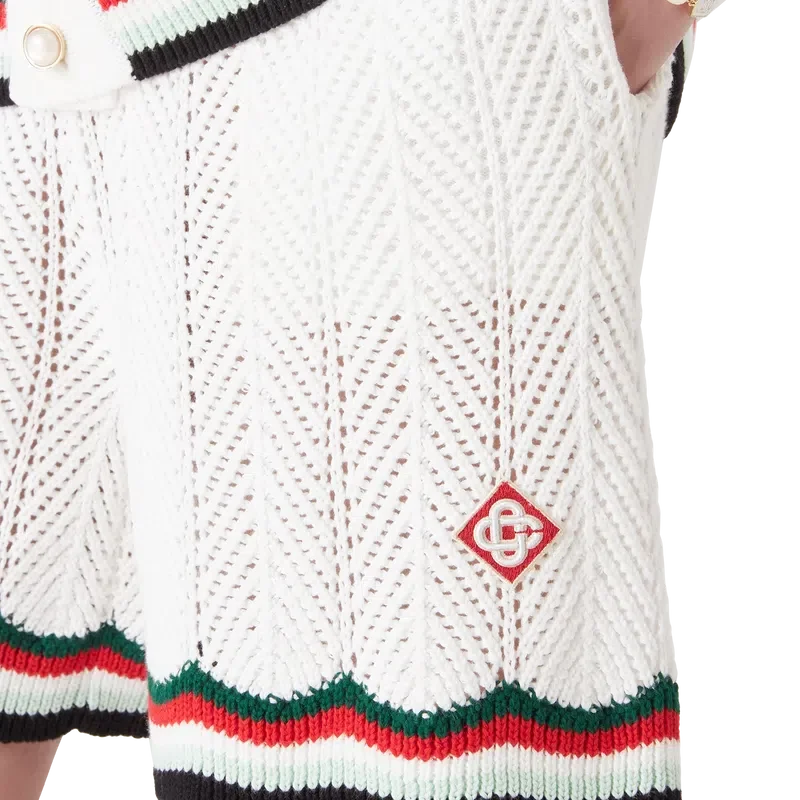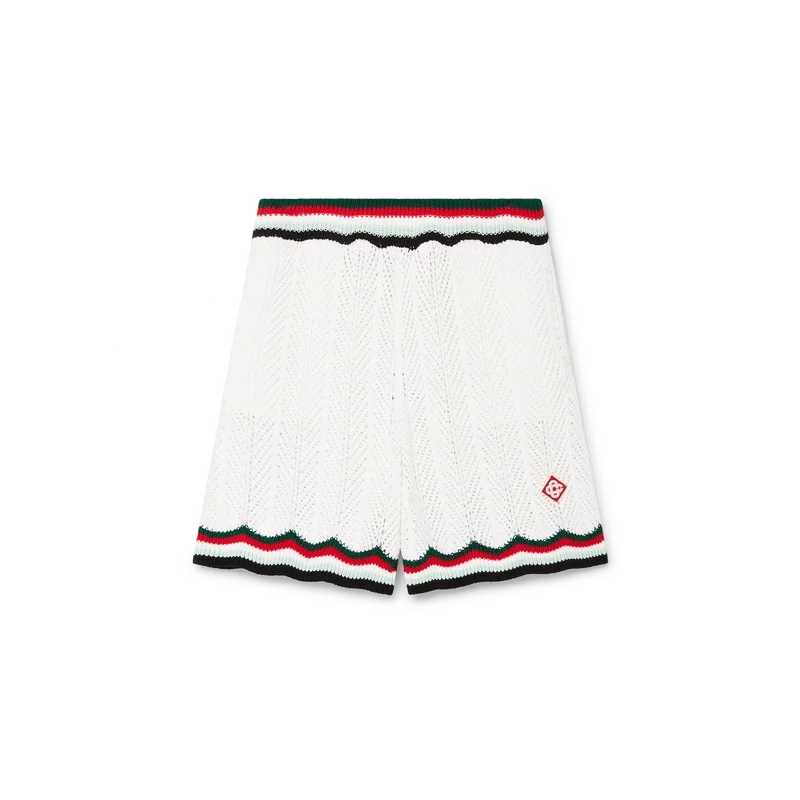 Die Chevron-Häkel-Shorts sind ein klassisches Design aus einem gehäkelten Baumwollstoff mit Chevron-Muster und dem charakteristischen Rautenlogo des Hauses. Abgerundet durch einen elastischen Bund, Seitentaschen in den Beinen sowie gestreifte Details an Saum und Bund.