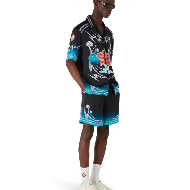 Die Blades Seidensatin-Shorts sind ein bedrucktes Design mit einem Motiv, das mit dem Kontrast zwischen zwei gegensätzlichen Empfindungen spielt – der Schärfe der Klinge und dem kalten, silbernen Chrom, kontrastiert mit der Wärme der Natur, wie den kräftigen Rosa- und Rottönen einer Orchideenblüte. Das Hinzufügen von Wasser verleiht dem Design eine frische, klare Note. Abgerundet durch einen elastischen Bund, einen Kordelzug, Eingrifftaschen und eine aufgesetzte Gesäßtasche.