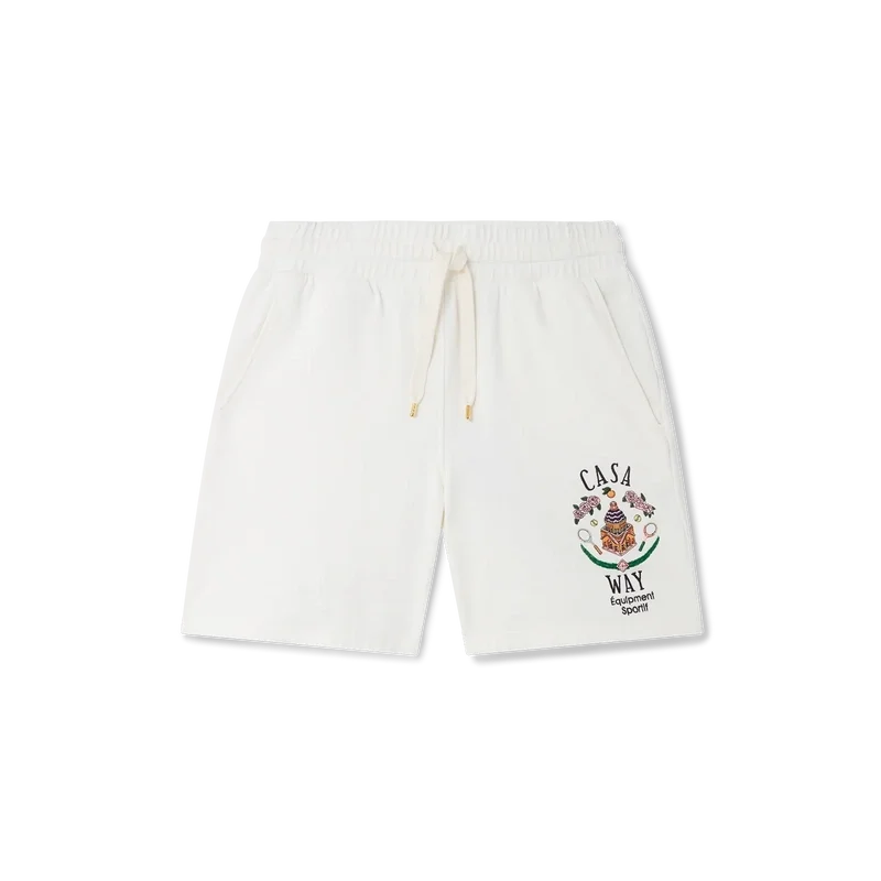 Die cremefarbenen Sweatshorts aus Bio-Baumwolle von Casa Way sind mit dem charakteristischen Design des Hauses verziert, das in dieser Saison neu interpretiert wurde und aus gestickten Illustrationen von Sportgeräten und floralen Details besteht. Abgerundet durch einen Kordelzug mit goldenen Enden, Seitentaschen und ein Casablanca Paris-Markenlabel, entworfen für eine klassische Passform.