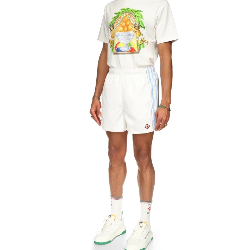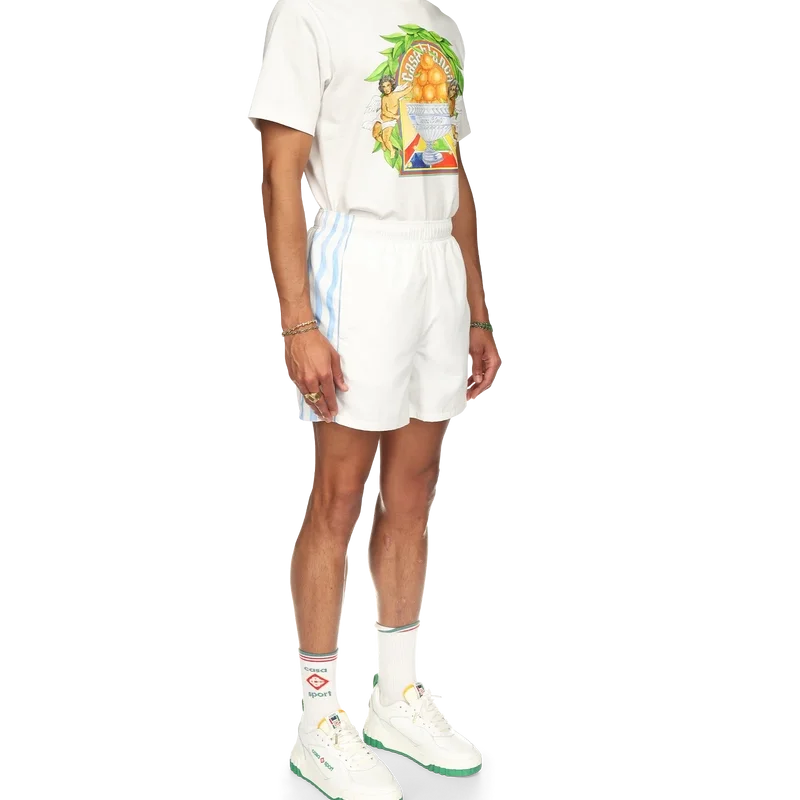 Die Equipement Sportif Track Shorts sind aus 100 % Polyester gefertigt und gefüttert und verfügen über blau-weiß gewellte Streifen an den Seitenteilen. Ausgestattet mit Vordertaschen und einer Gesäßtasche, einem elastischen Bund, dem Diamant-Logo des Hauses und einem Casablanca-Markenlabel.