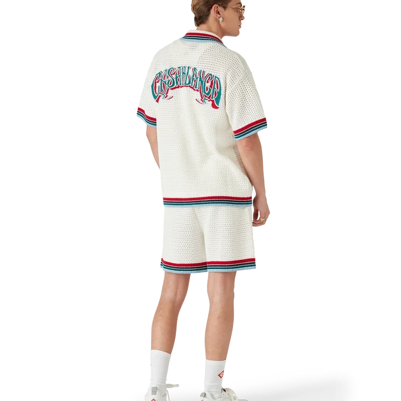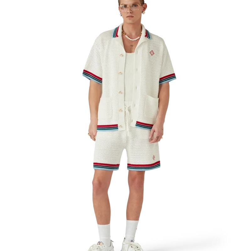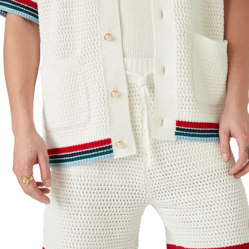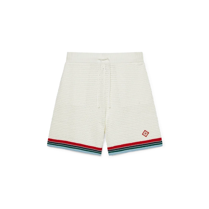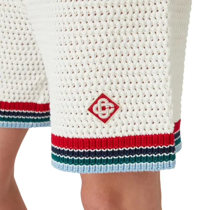 Die Gothic Crochet Shorts sind ein Modell mit weicher Textur aus gestricktem Baumwollstoff, verziert mit dem charakteristischen Rautenlogo des Hauses. Mit geripptem, elastischem Bund mit Kordelzug, Seitentaschen und kontrastierenden Streifen an den Beinen.<!–