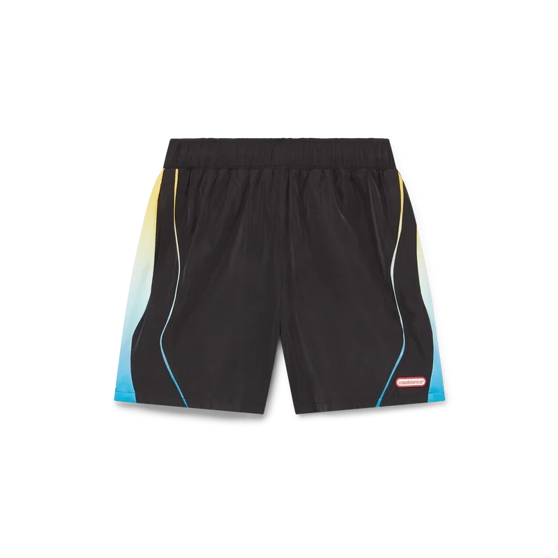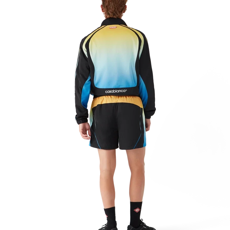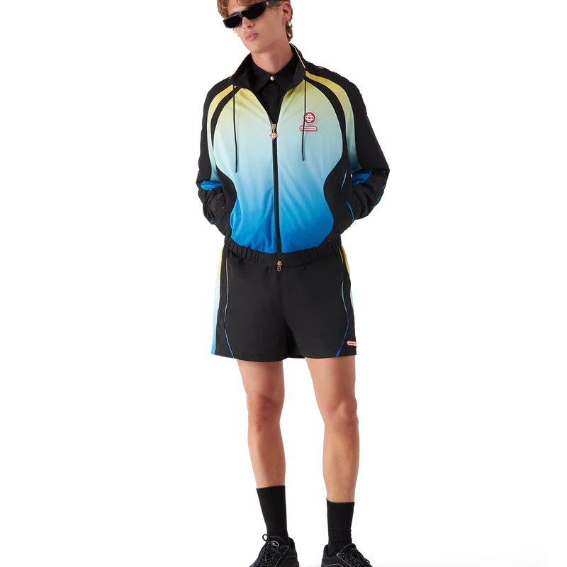 Die Gradient-Fußballshorts sind ein Sportbekleidungsdesign in unserem saisonalen Farbverlauf, inspiriert von den lebhaften und auffälligen natürlichen Farbtönen der Pfeilgiftfrösche. Die kräftigen Blau- bis Gelbtöne dienen in der Natur als Warnsignal und werden mit derselben aufmerksamkeitsstarken Absicht in unseren Drucken und Sportbekleidungsstilen verwendet, kontrastiert durch tiefschwarze Einsätze in organischen, fließenden Formen, die die charakteristischen Muster dieser Tiere nachahmen. Abgerundet durch das charakteristische Casablanca-Logo des Hauses, einen elastischen Bund, einen Kordelzug, seitliche Eingrifftaschen mit Reißverschluss und ein gelbes Rückenteil unterhalb des Bundes.