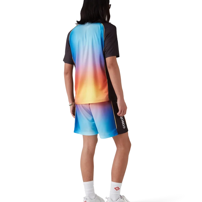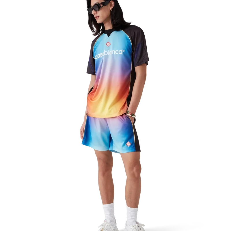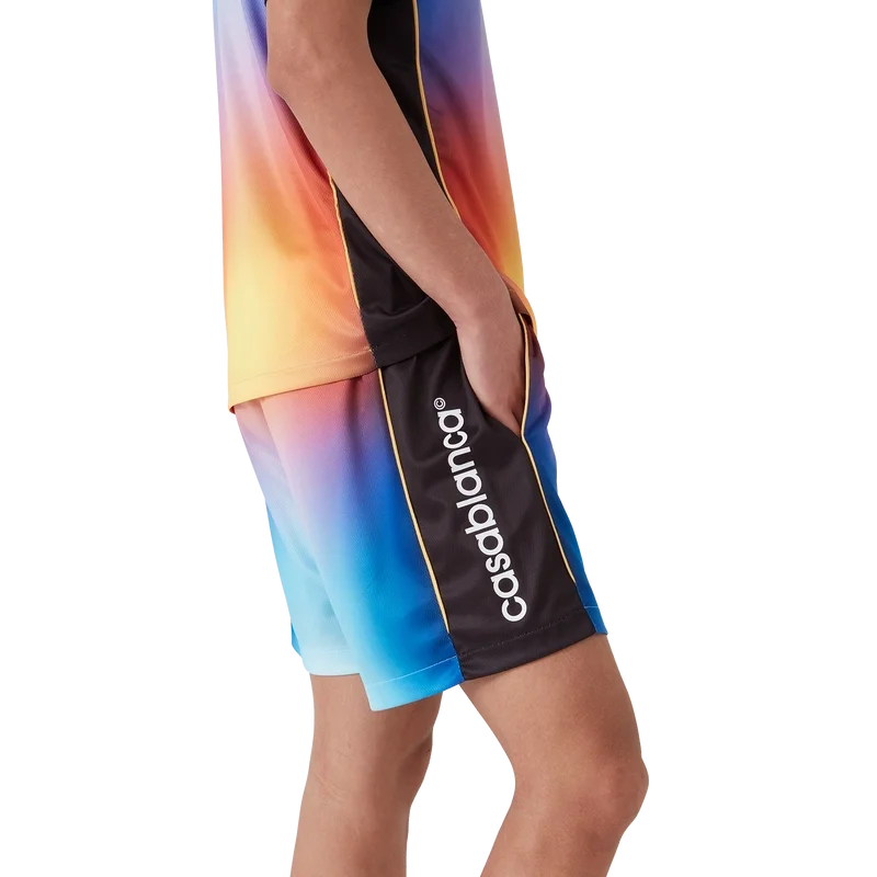 Die Gradient Football Shorts sind ein Sportbekleidungsdesign aus einem Stoff mit Farbverlauf, der an der Seite das charakteristische Casablanca-Logo des Hauses aufweist. Abgerundet durch einen elastischen Bund mit Kordelzug und seitliche Eingrifftaschen.