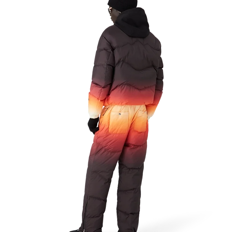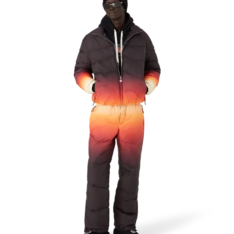 Die Skihose ist ein raffiniertes Design von Apras-Sport aus einem Stoff mit Farbverlauf, dessen mehrfarbiger Farbverlauf von dem spektakulären Alpenglühen inspiriert ist, das Japans bergige Landschaft erhellt. Sie erinnert an den magischen Übergang, wenn rosa und violette Farbtöne über schneebedeckte Gipfel fließen und ländliche Täler im letzten Licht des Tages leuchten. Abgerundet wird das Design durch einen elastischen Frontverschluss, Seitentaschen mit Reißverschluss und Gesäßtaschen mit versilberten Beschlägen sowie Reißverschlüsse an den Knöcheln.