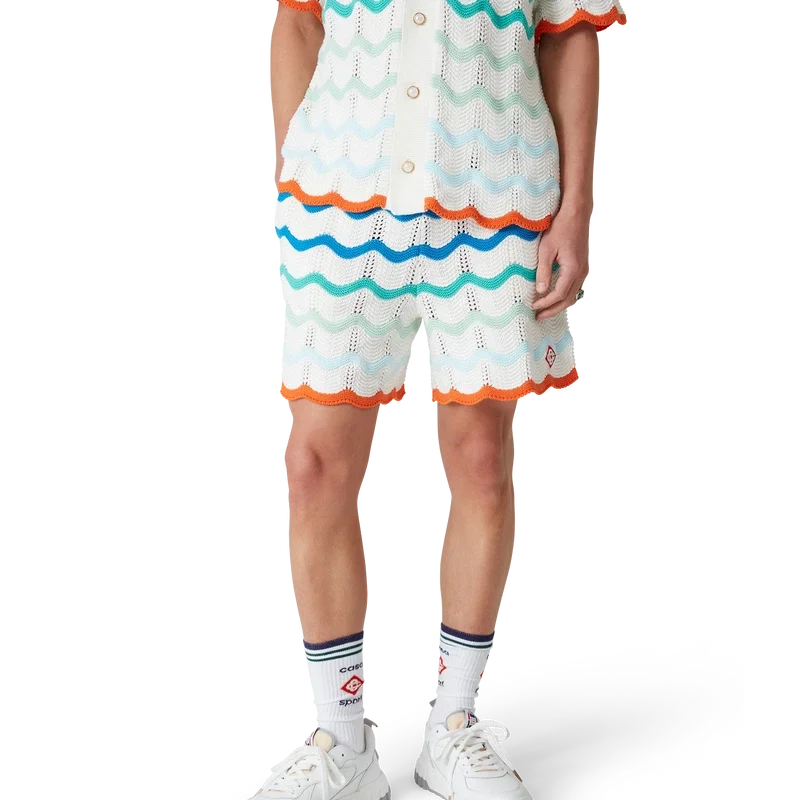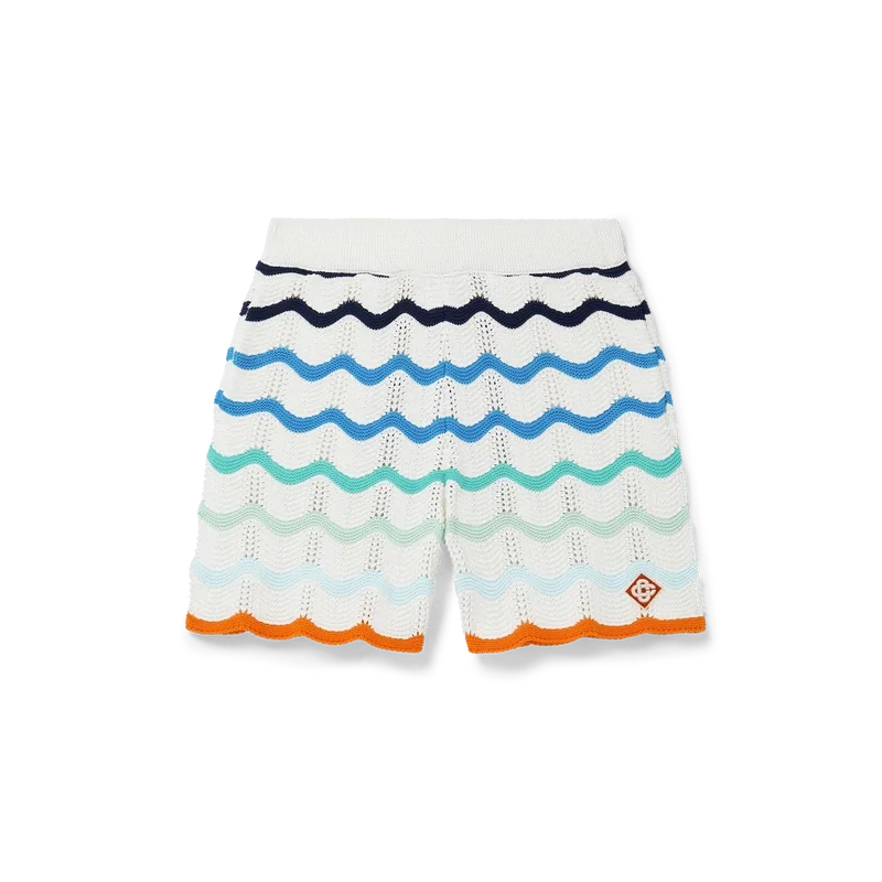 Die „Gradient Wave Crochet“ Shorts sind ein klassisches Design aus Baumwollstoff mit Häkelstruktur und Farbverlauf, das das vom Memphis-Stil inspirierte Designelement des Hauses in Farbverläufen aufgreift und damit an das Reise- und Urlaubsthema der Kapselkollektion anknüpft. Abgerundet durch einen gerippten Bund, einen Kordelzug und kontrastierende Kanten am Saum.