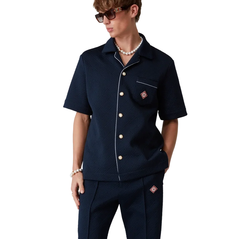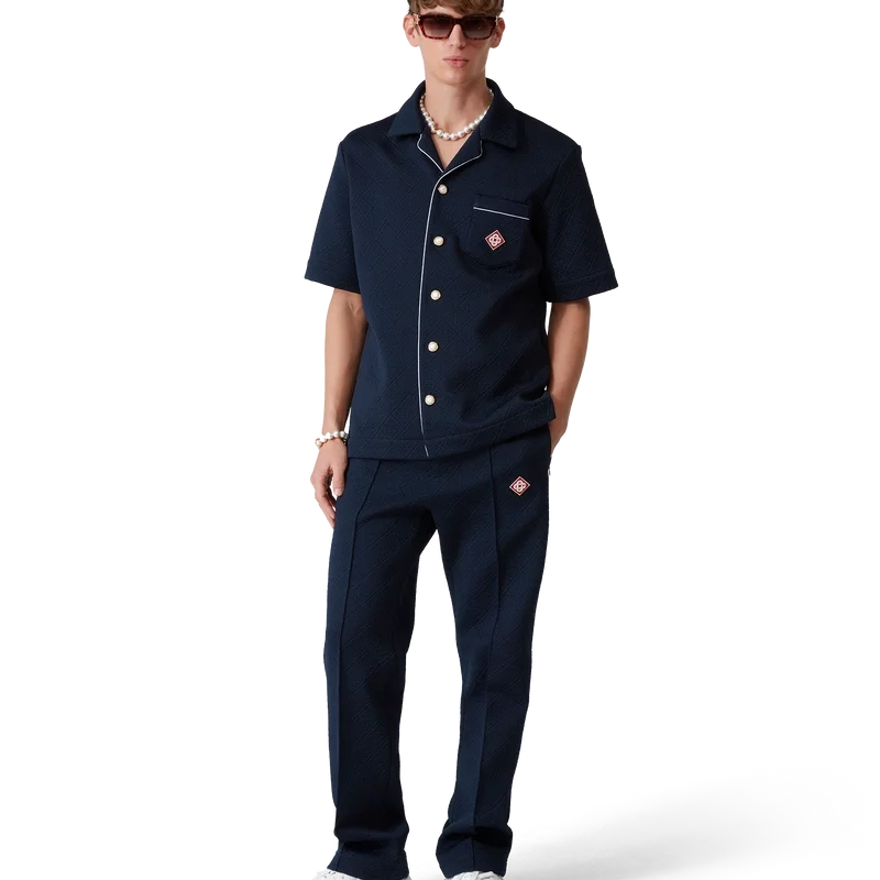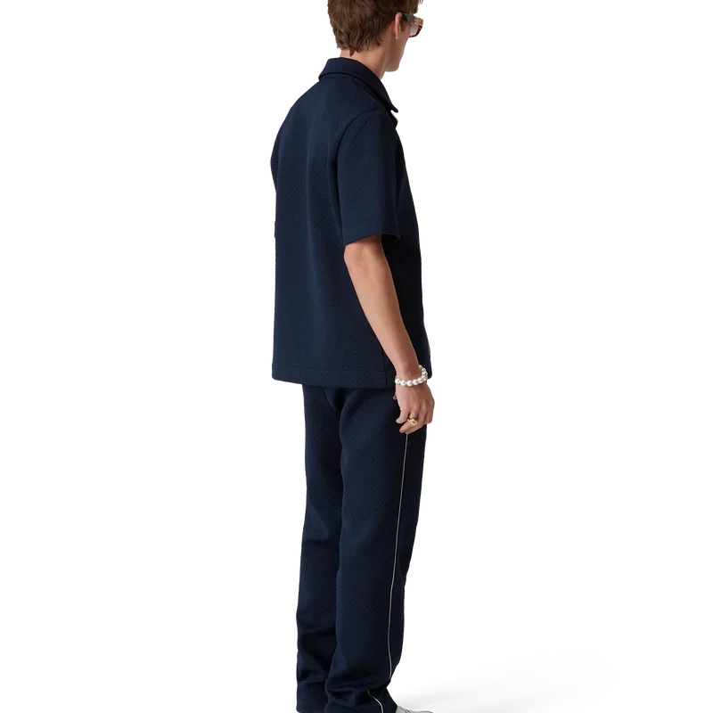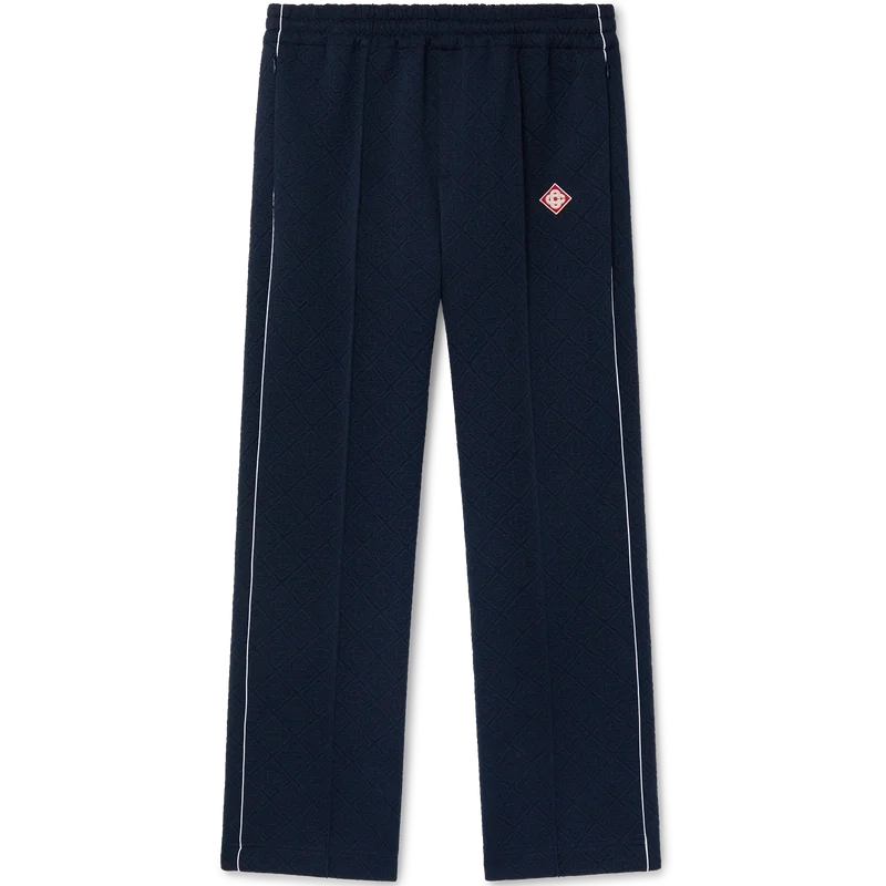 Die Jacquard-Monogramm-Jogginghose ist ein von Sportbekleidung inspiriertes Modell mit geradem Bein, gefertigt aus einem Jacquard-Strickstoff. Sie verfügt über einen elastischen Bund mit Kordelzug, Seitentaschen, Biesen an der Vorderseite, kontrastierende Paspeln an den Seiten und das charakteristische Rautenlogo des Hauses.