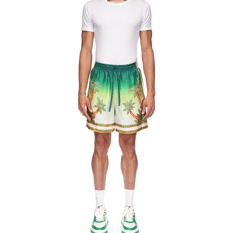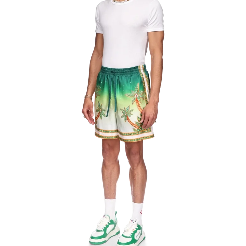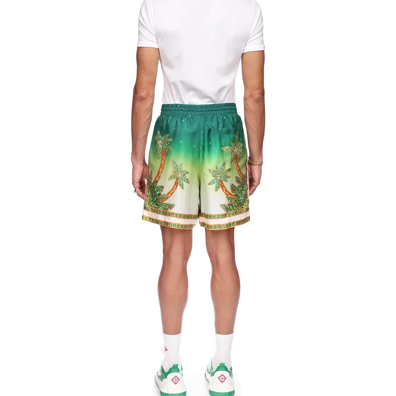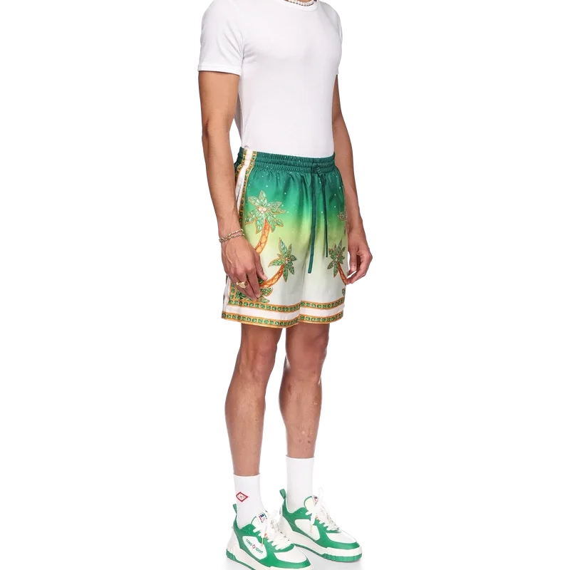 Die Joyaux D’afrique Seidenshorts sind ein Modell mit Allover-Print, das saisonale Motive mit Naturbezügen aus Nigeria und den Schmuckdesigns des Hauses kombiniert, vermischt mit unserem traditionellen Tennisclub-Layout. Hergestellt aus Seidentwill mit elastischem Bund, Kordelzug, Seitentaschen und einer Gesäßtasche.