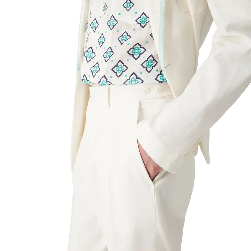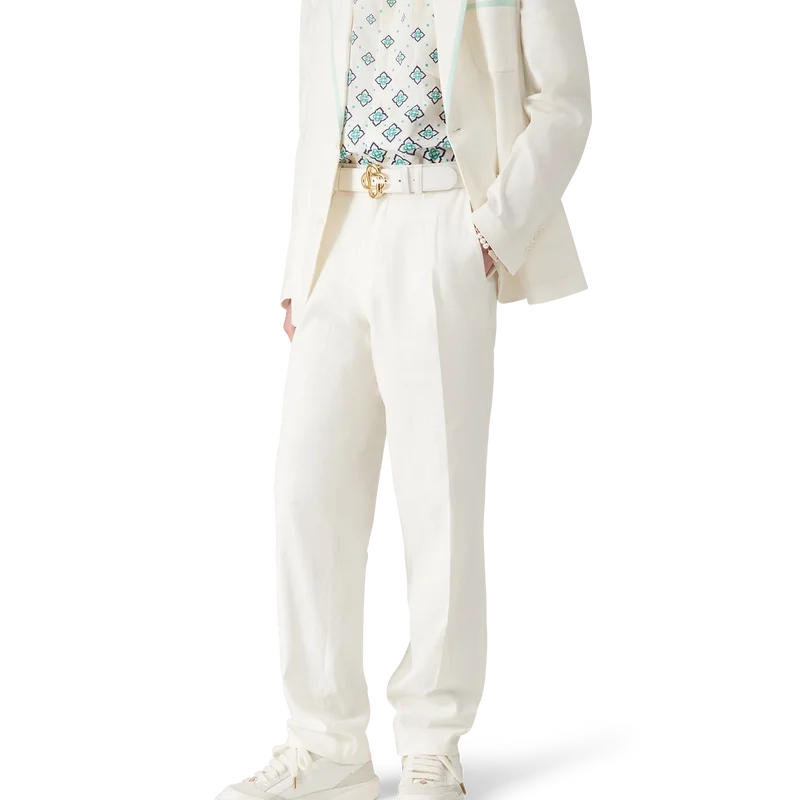 Die Leinen-Plissee-Hose ist ein konisch zulaufendes Modell aus Leinenstoff. Mit Reißverschluss, schrägen Vordertaschen, Paspeltaschen hinten, Gürtelschlaufen und Falten.