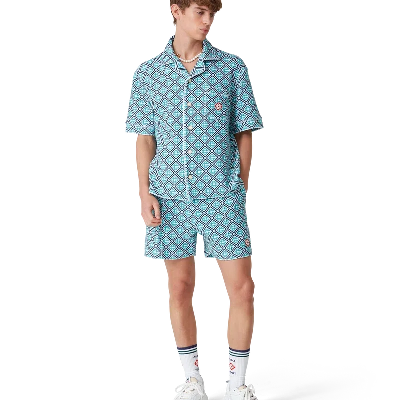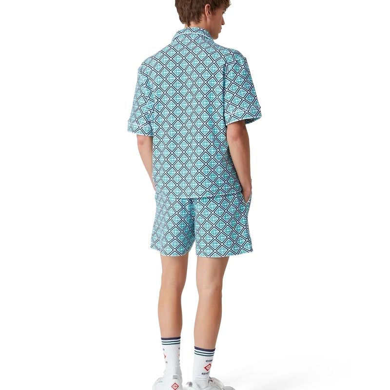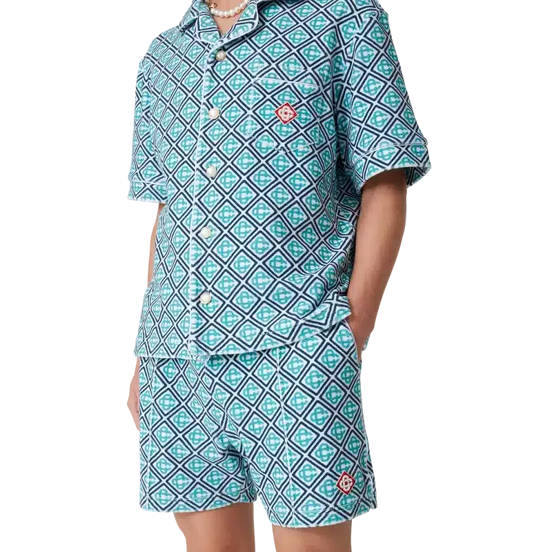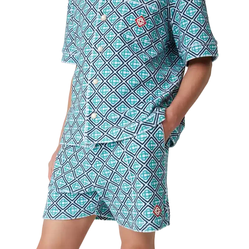 Die Monogram-Frottee-Shorts sind ein klassisches Design aus Monogram-Frottee, das eine neue Interpretation des charakteristischen Casablanca-Prints bietet. Mit elastischem Bund, innenliegendem Kordelzug mit goldfarbenen Enden, Biesen an der Vorderseite, einer Gesäßtasche mit Reißverschluss, schrägen Seitentaschen sowie Paspeldetails an den Vorder- und Gesäßtaschen sowie an den Seiten.