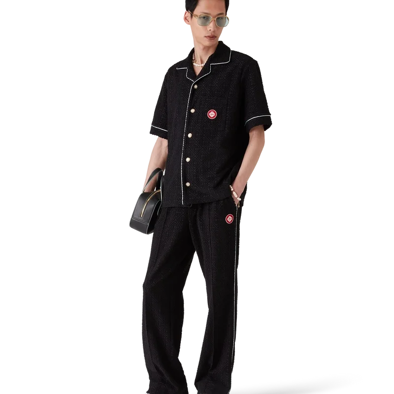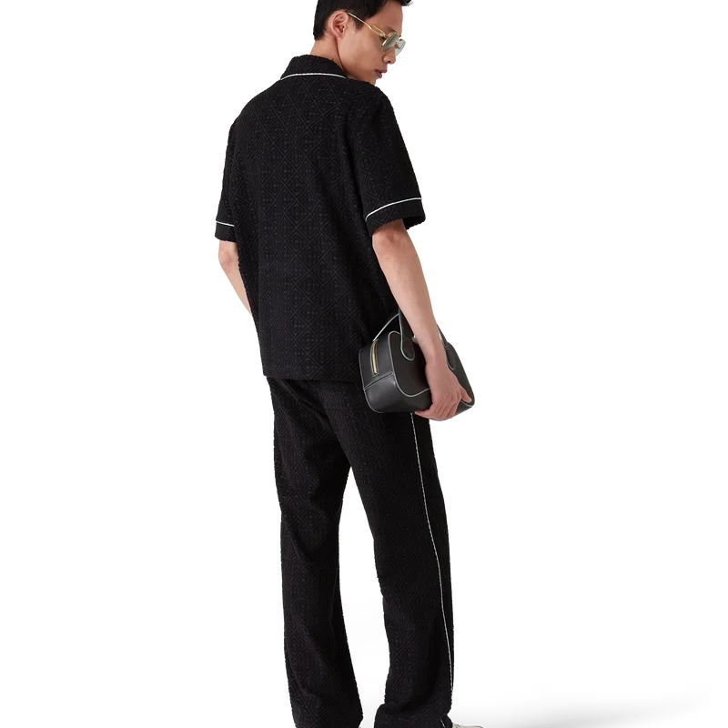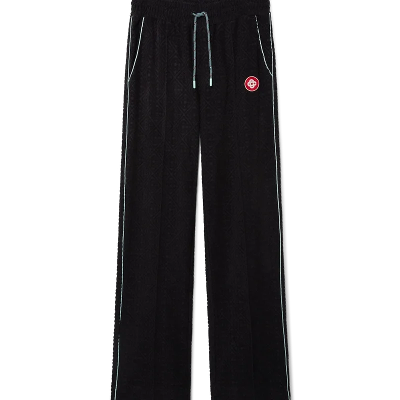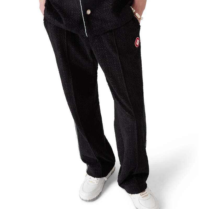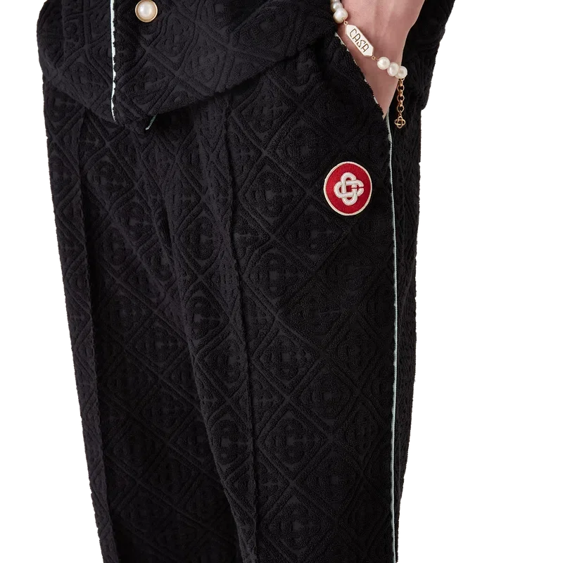 Die Monogram-Jacquard-Frottee-Hose ist ein Modell mit geradem Bein aus Frottee-Stoff und einem aufgesetzten Logo-Patch mit dem ineinander verschlungenen „CC“-Logo des Hauses. Abgerundet wird sie durch einen elastischen Bund, einen Kordelzug, schräge Taschen, Biesen an der Vorderseite, Paspeldetails an den Taschen und an den Beinen sowie eine aufgesetzte Gesäßtasche.