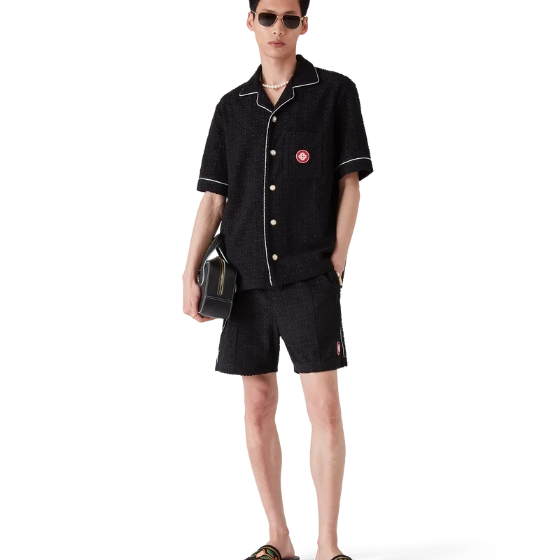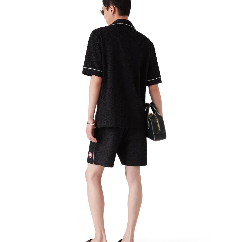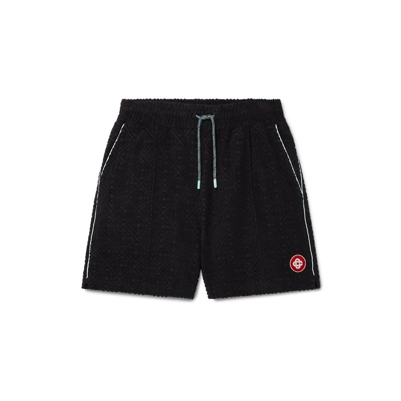 Die Monogram-Frottee-Shorts sind ein klassisches Design aus Monogram-Frottee. Sie verfügen über einen elastischen Bund, einen Kordelzug mit goldenen Enden, Biesen an der Vorderseite, eine Gesäßtasche mit Reißverschluss, schräge Seitentaschen sowie Paspeldetails an den Vorder- und Gesäßtaschen sowie an den Seiten.