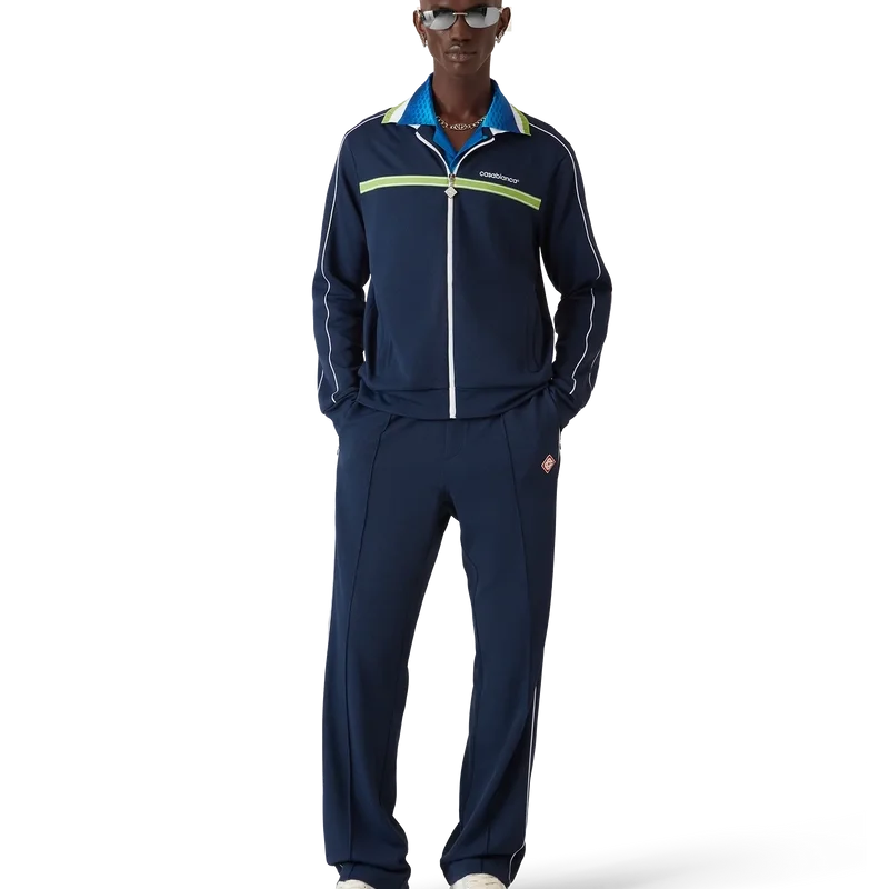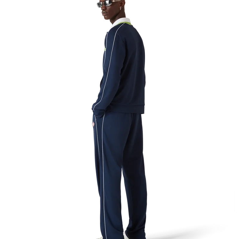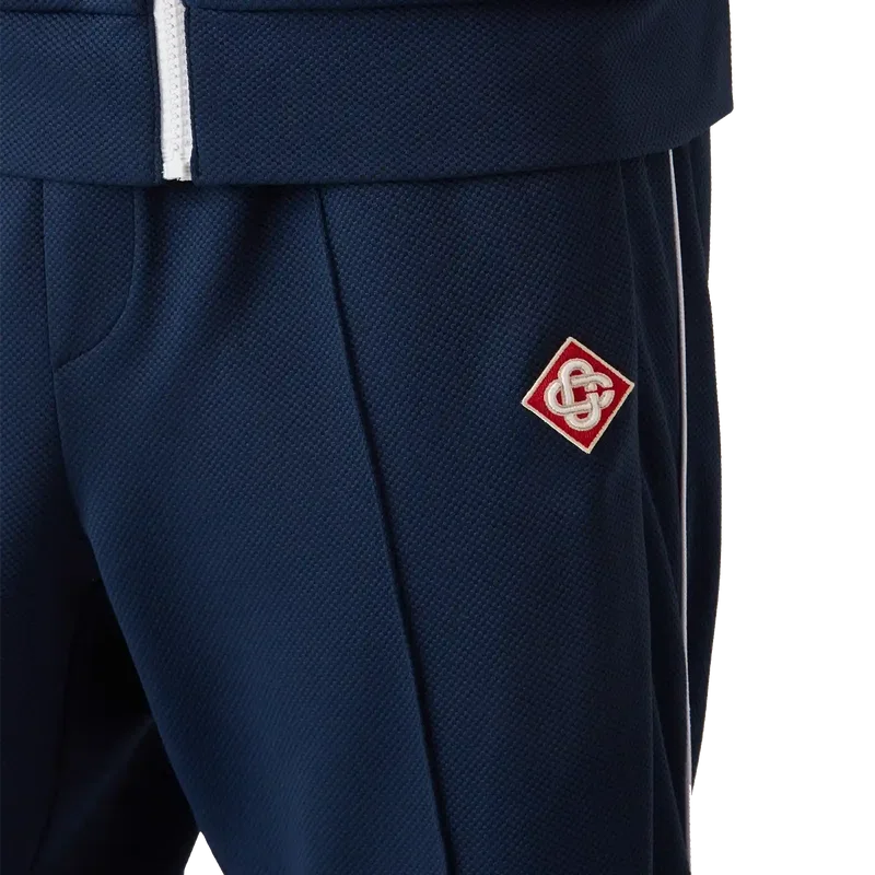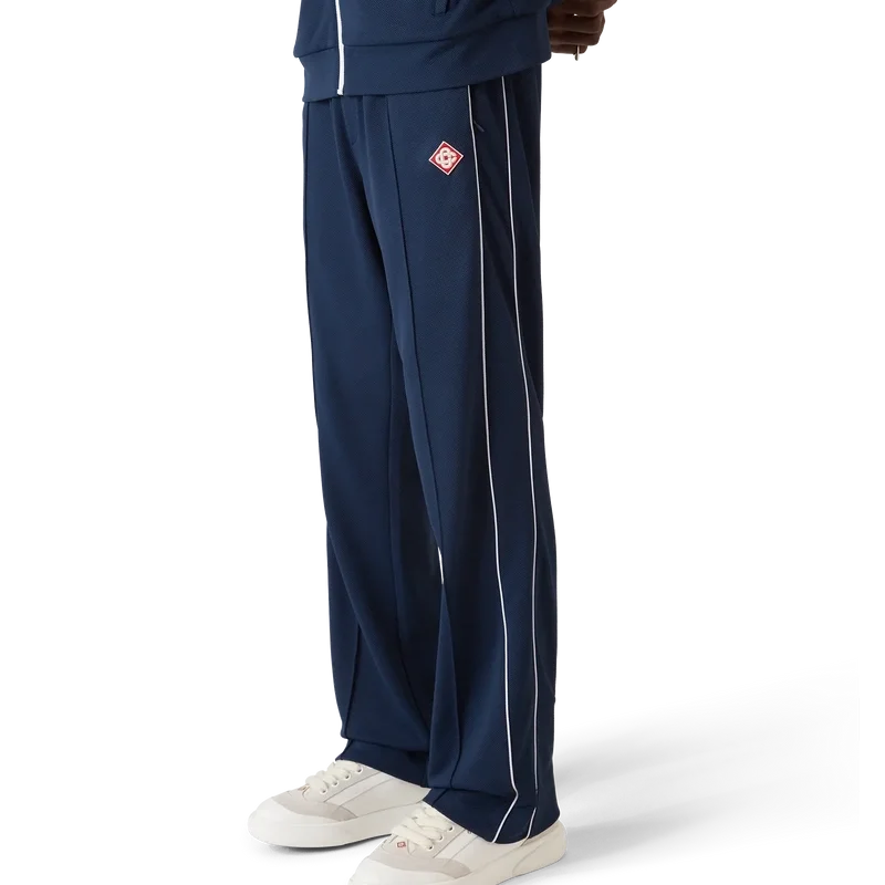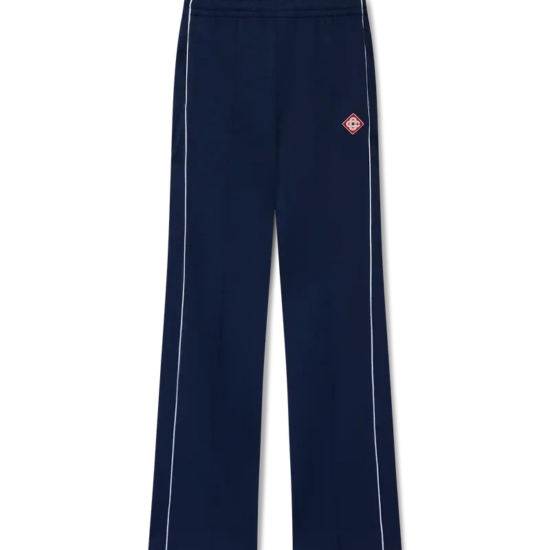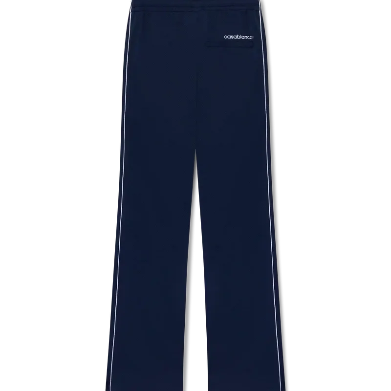 Die Piqué-Jogginghose ist ein Sportmodell mit geradem Bein und dem charakteristischen Rautenlogo des Hauses. Sie verfügt über einen elastischen Bund, einen Kordelzug, Seitentaschen, eine aufgesetzte Gesäßtasche mit Reißverschluss und Casablanca-Logo sowie Paspeldetails an den Seiten.