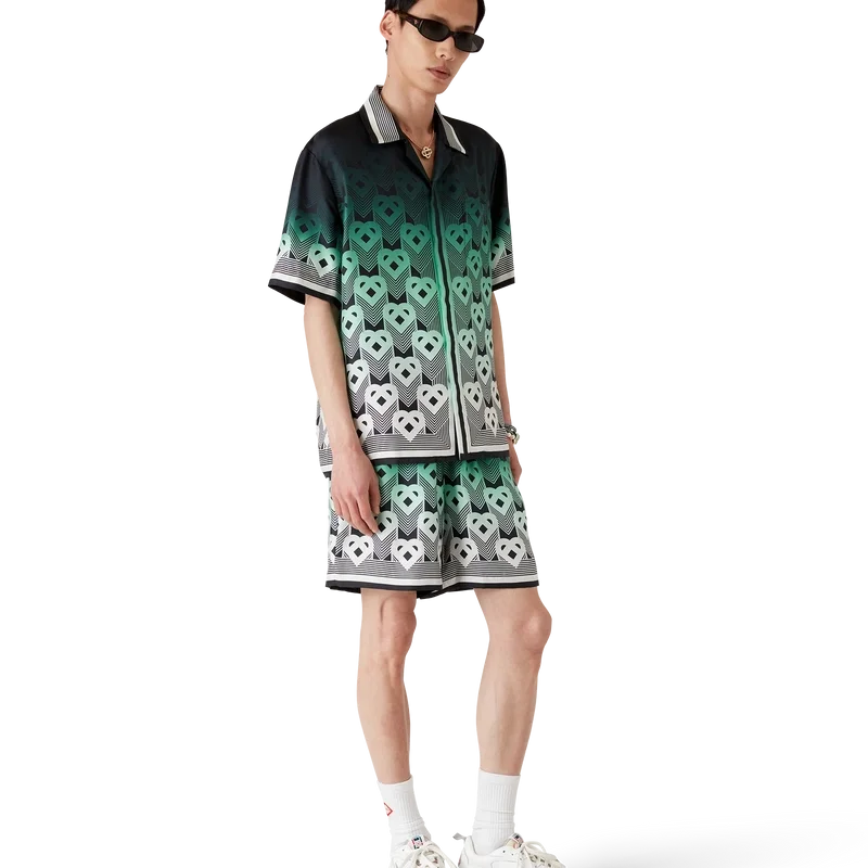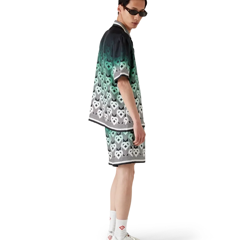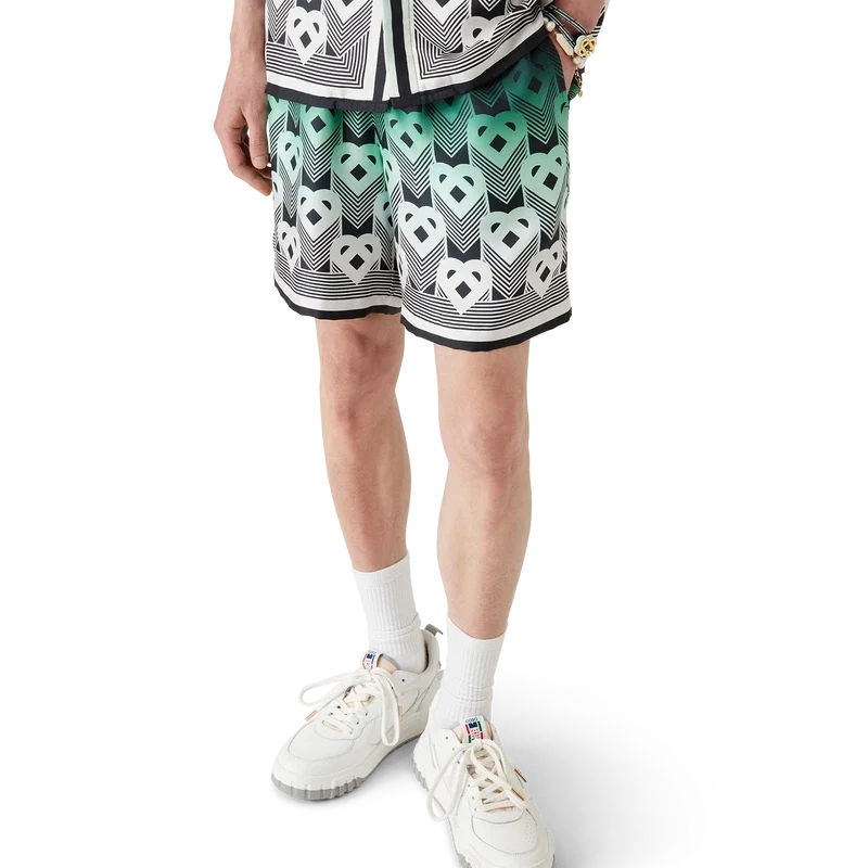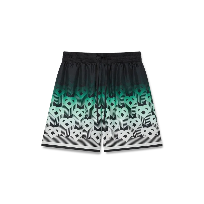 Die Seidenshorts mit Monogramm-Farbverlauf sind ein durchgehend bedrucktes Design mit dem Herz-Monogramm des Hauses vor einem mintfarbenen Farbverlauf, der die Farbgebung des Park Hyatt aufgreift – ein ikonisches Hotel in Tokio, dessen Innenausstattung in Mint und Schwarz gehalten ist – gefertigt aus einem Seidentwill mit Monogramm. Abgerundet durch einen elastischen Bund, einen Kordelzug, Seitentaschen, eine Gesäßtasche und gestreifte Details am Saum.