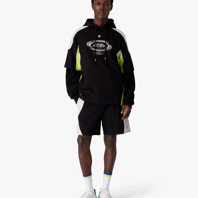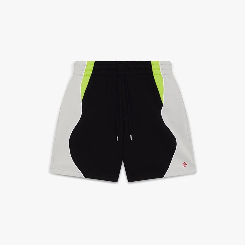 Die schwarz-grauen Colourblock-Sweatshorts sind ein raffiniertes Sportbekleidungsdesign mit einem Colourblock-Muster und dem charakteristischen Diamant-Logo des Hauses. Abgerundet durch einen elastischen Bund, einen Kordelzug mit goldenen Enden, kontrastierende Paspeldetails und seitliche Eingrifftaschen.