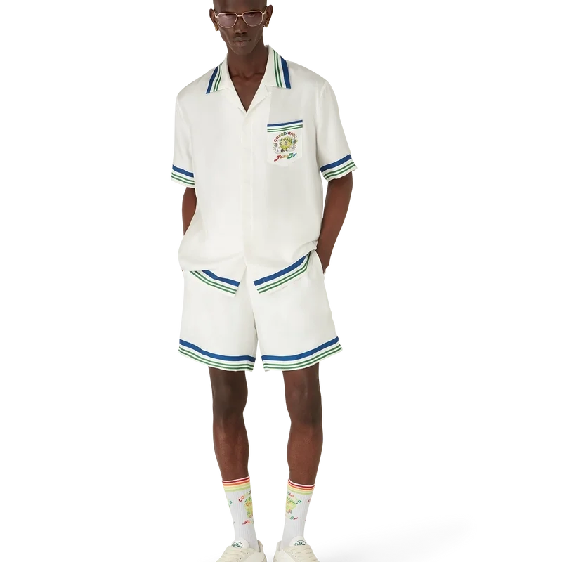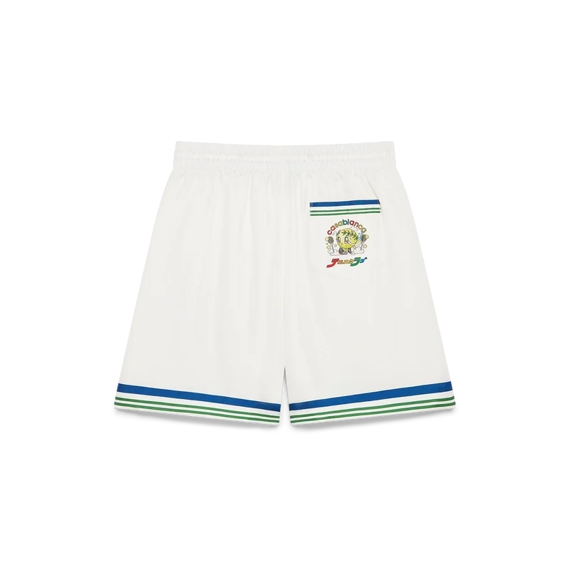Die Tennis Club Icon Seidentwill-Shorts sind ein bedrucktes Design mit saisonalen Motiven des Kawaii-Tennisballs – diese Figur ist ein zentraler Bestandteil unseres Universums. Sie vereint Elemente wie das Lorbeerblatt, den Atlantis-Sneaker, den Schläger und die Kawaii-Augen. Wir haben uns dafür entschieden, diese Figur als zentrales Motiv für alle Herrenmodelle der Kollektion zu verwenden. Abgerundet durch einen elastischen Bund, einen Kordelzug, Seitentaschen in den Beinen, eine aufgesetzte Gesäßtasche und blau-weiß-grün gestreifte Kanten an der Gesäßtasche.