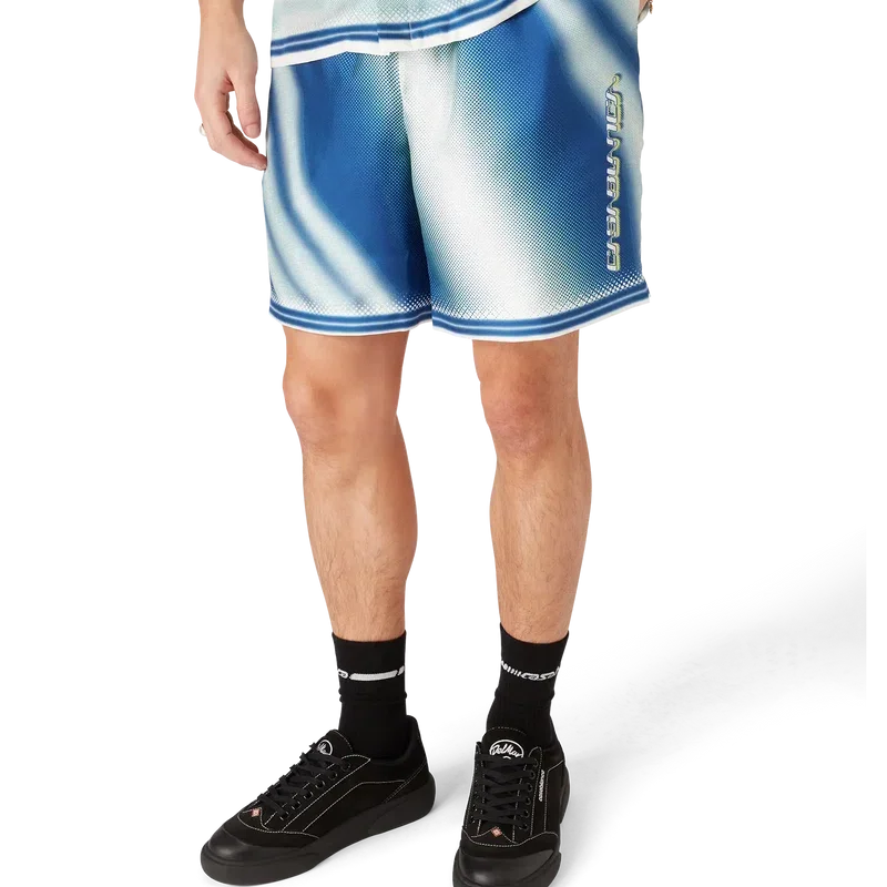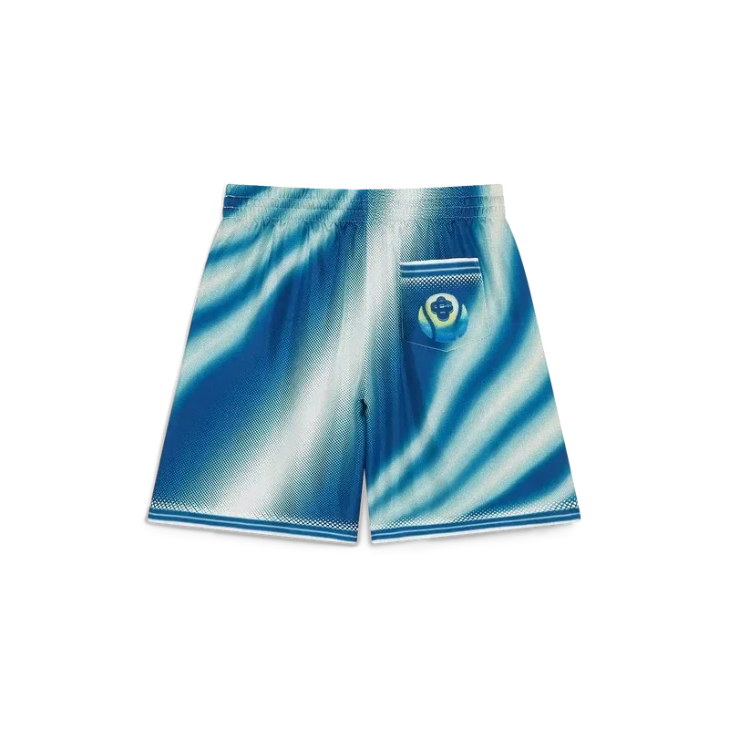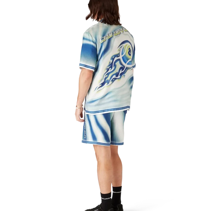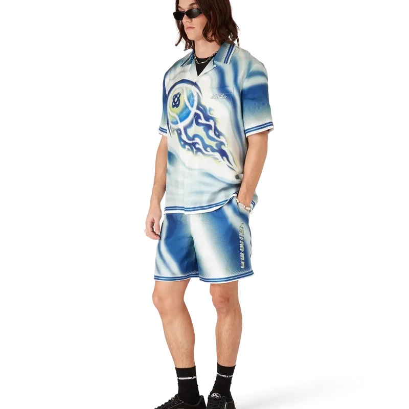 Die „Art of the Serve“-Seidenshorts sind mit einem Allover-Print versehen, der das charakteristische Tennisball-Motiv des Hauses im Flug zeigt und die grundlegende Balance aus Kraft, Geschwindigkeit und Kontrolle widerspiegelt. Abgerundet durch einen elastischen Bund, einen Kordelzug, Seitentaschen in den Beinen, eine aufgesetzte Gesäßtasche, gestreifte Saumdetails und das Casablanca-Logo.
