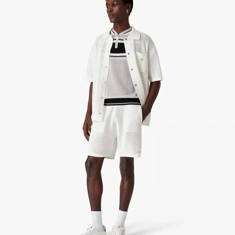 Die weißen Mesh-Shorts zeichnen sich durch ein raffiniertes Design aus und sind mit dem Warped-Logo des Hauses am Bein versehen. Abgerundet durch einen elastischen Bund, einen Kordelzug, Nahttaschen und gestreifte Saumdetails.