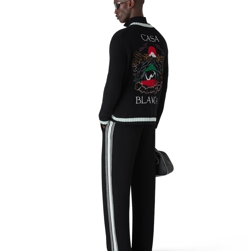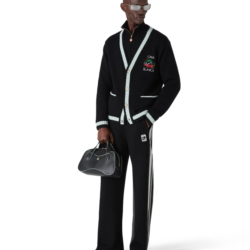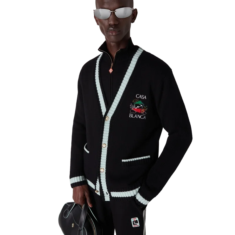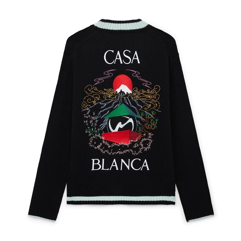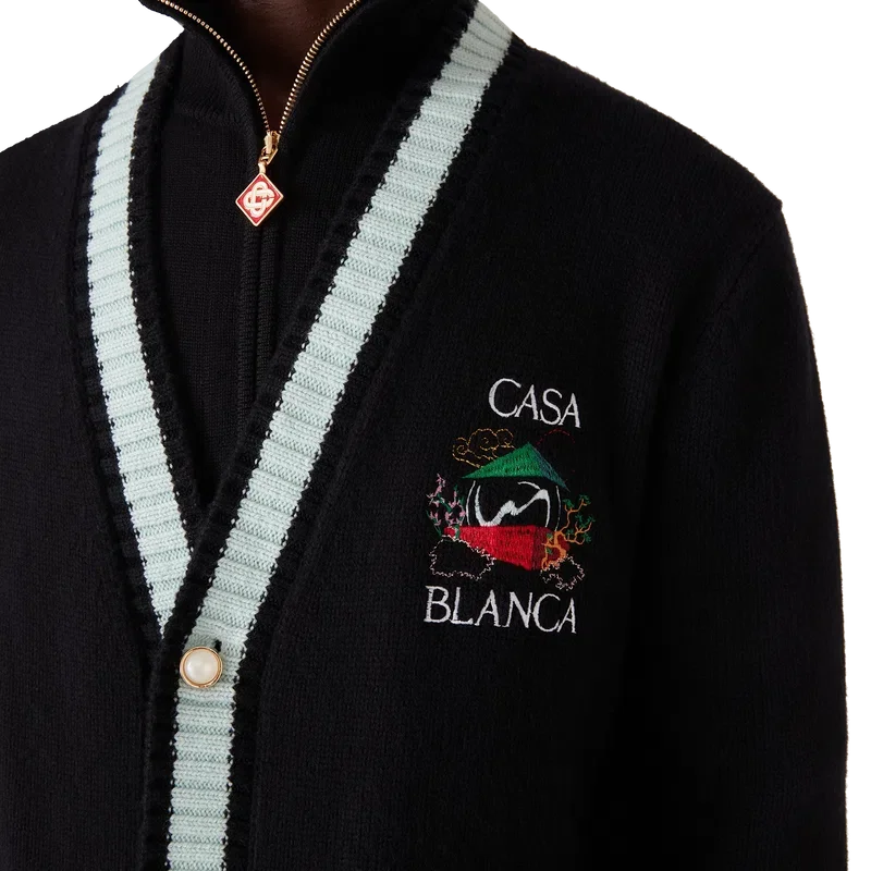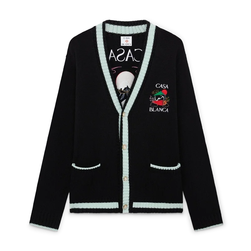 Der Casa Mountain Temple Cardigan ist ein langärmeliges Modell mit gesticktem saisonalem Motiv, gefertigt aus Merinowolle. Abgerundet durch einen klassischen Rundhalsausschnitt sowie gerippte Bündchen und Saum.